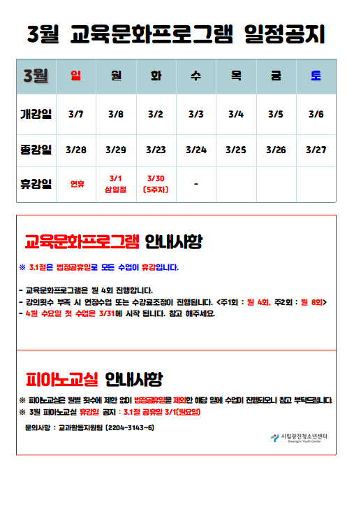 | [±³°ú] ±³À°¹®ÈÇÁ·Î±×·¥ 3¿ù ÀÏÁ¤°øÁö ¾È³» | ||