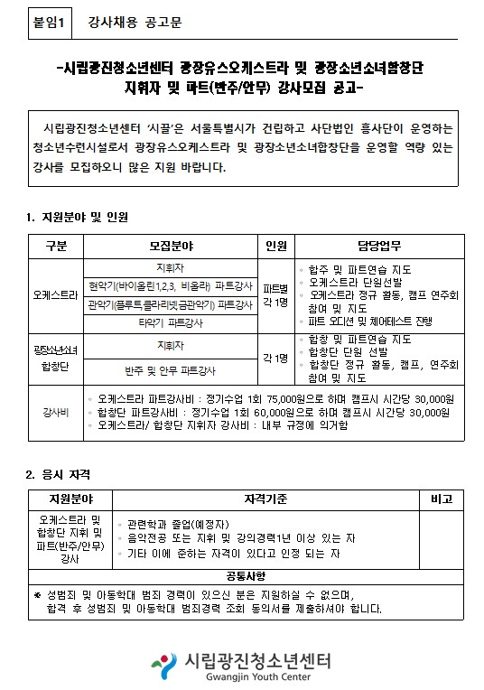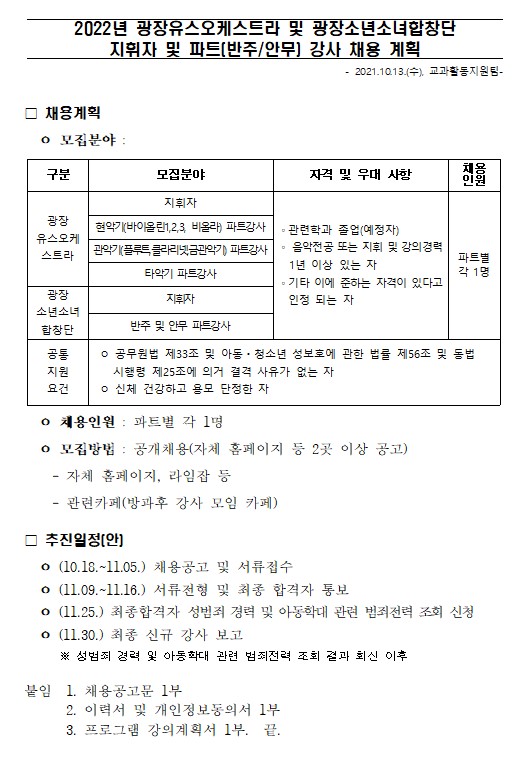 | 2022³âµµ ±¤ÀåÀ¯½º¿ÀÄɽºÆ®¶ó ¹× ±¤Àå¼Ò³â¼Ò³àÇÕâ´Ü ÁöÈÖÀÚ/ÆÄÆ® °»ç¸ðÁý °ø°í | ||