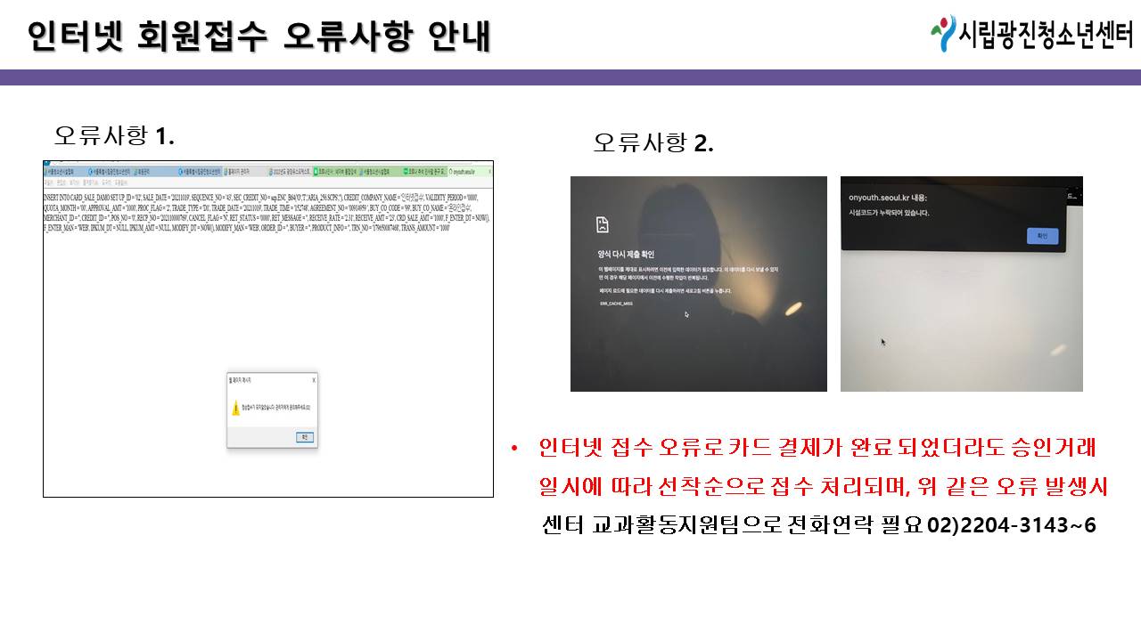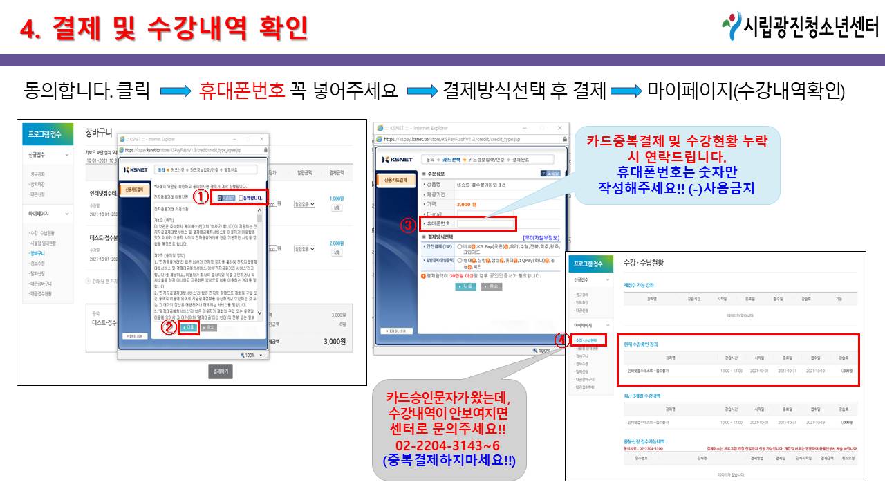 * Áß¿ä»çÇ× * 1) ¼ö°»ý À̸§À¸·Î ȸ¿ø°¡ÀÔ ÈÄ Á¢¼öÇʼö 2) Á¢¼ö ±â°£/½Ã°£ ³» ¹æ¹®Á¢¼ö ºÒ°¡ (ÀÎÅͳÝÁ¢¼ö¸¸ °¡´É) 3) °áÁ¦½Ã ÈÞ´ëÆù¹øÈ£ ÀԷ½à (-)Á¦¿Ü ÈÄ ¼ýÀÚ¸¸ ÀÔ·Â!!! (-) ÀԷ½à º»ÀÎÈ®ÀÎ ºÒ°¡ 4) ÀÎÅÍ³Ý Á¢¼ö ¿À·ù·Î ÀÎÇØ Ä«µå °áÁ¦°¡ ¿Ï·á µÇ¾ú´õ¶óµµ ¼±Âø¼øÀ¸·Î Á¢¼öó¸® (Á¤¿øÃʰú½Ã °³º° ¿¬¶ô ÈÄ Ä«µåÃë¼Ò 󸮵Ê) 5) °áÁ¦¹æ½Ä Áß SMS°áÁ¦´Â Á¢¼ö ºÒ°¡