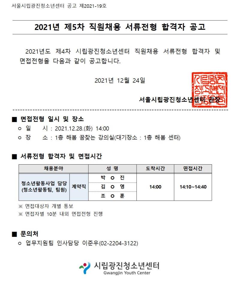 | ½Ã¸³±¤ÁøÃ»¼Ò³â¼¾ÅÍ Á÷¿øÃ¤¿ë ¼·ùÀüÇü ÇÕ°ÝÀÚ °ø°í(û¼Ò³âȰµ¿»ç¾÷ ´ã´ç) | ||