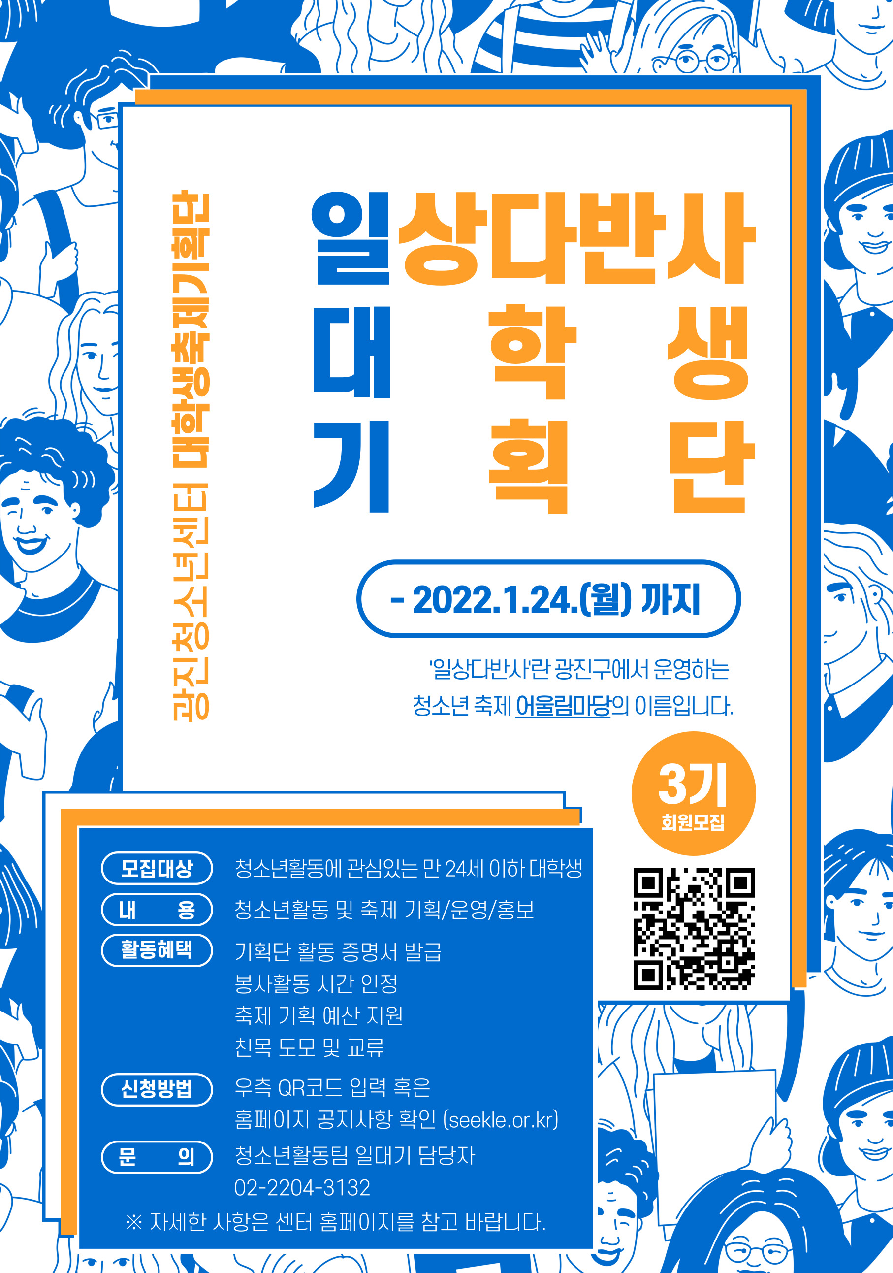 [ ±¤ÁøÃ»¼Ò³â¼¾ÅÍ ´ëÇлýÃàÁ¦±âȹ´Ü ÀÏ´ë±â 3±â ½Å±Ô ¸ðÁý ] * ±¤ÁøÃ»¼Ò³â¼¾ÅÍ ´ëÇлýÃàÁ¦±âȹ´Ü 'ÀÏ´ë±â' 3±â¿¡¼ Ȱµ¿ÇÒ ¿¡³ÊÁö ³ÑÄ¡´Â ´ëÇлý û¼Ò³âÀ» ¸ðÁýÇÕ´Ï´Ù! * [¸ðÁý ¾È³»] 1. ¸ðÁý´ë»ó: û¼Ò³â¿¡ °ü½ÉÀÌ ÀÖ°í, ÃàÁ¦ ±âȹ ¿î¿µ¿¡ °ü½É ÀÖ´Â ´ëÇлý û¼Ò³â(¸¸ 24¼¼ ÀÌÇÏ) 2. ¸ðÁýÀοø: 21¸í 3. ¸ðÁý±â°£: 2022.1.14.(±Ý) ~ 1.24.(¿ù) 4. ½Åû¹æ¹ý: ±¸±Û ¼³¹®Áö ½Åû¼ ÀÛ¼º ¹× Á¦Ãâ 5. ¼±Á¤¹æ¹ý: ½Åû¼ °ËÅä(1.25.È) ¢¡ ÀüȸéÁ¢ (1.26.¼ö~27.¸ñ) ¢¡ ÃÖÁ¾ÇÕ°Ý ¾È³» (1.28.±Ý) ¢¡ À§ÃË½Ä ¹× ¿À¸®¿£Å×À̼Ç(2. 5.Åä) *¸éÁ¢Àº ÀüÈ·Î ÁøÇàµÇ¸ç, À§Ã˽ÄÀº ¼¾ÅÍ ³»¿¡¼ ÁøÇàµË´Ï´Ù. [Ȱµ¿ ¾È³»] 1. Ȱµ¿±â°£: 22³â 2¿ù ~ 12¿ù (¿ù 1ȸ Á¤±â ȸÀÇ Çʼö Âü¿©) 2. Ȱµ¿ÇýÅÃ: - ±âȹ´Ü Ȱµ¿ Áõ¸í¼ ¹ß±Þ - ºÀ»çȰµ¿ ½Ã°£ ÀÎÁ¤ - ÃàÁ¦ ±âȹ ¿¹»ê Áö¿ø - Ä£¸ñ µµ¸ð ¹× ±³·ù 3. À§ÃË½Ä ¹× ¿À¸®¿£Å×À̼Ç: 2. 5.(Åä) ¿ÀÈÄ 2½Ã ~ 6½Ã (½Ã°£Àº Á¶Á¤µÉ ¼ö ÀÖ½À´Ï´Ù.) [¹®ÀÇ»çÇ×] ÀÏ´ë±â ´ã´çÀÚ À̵µ¿ì û¼Ò³âÁöµµ»ç (02-2204-3132) [½Åû¸µÅ©] https://forms.gle/L6SKyeTzw2HS4Kp58