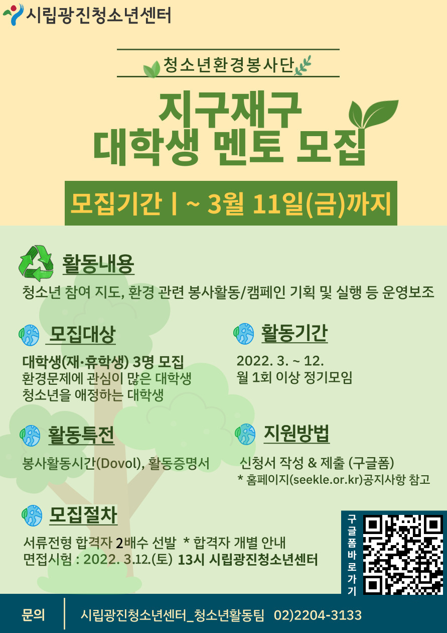 1. ¸ðÁý°³¿ä °¡. ´ë»ó: ´ëÇлý(24¼¼ ÀÌÇÏ) ³ª. Ȱµ¿³»¿ë: û¼Ò³â Âü¿© Áöµµ, ȯ°æ °ü·Ã ºÀ»çȰµ¿/Ä·ÆäÀÎ ±âȹ ¹× ½ÇÇà µî ¿î¿µº¸Á¶ ´Ù. ¸ðÁý±â°£: 3¿ù11ÀÏ(±Ý) ¿ÀÀü 11½Ã±îÁö ¶ó. ¸ðÁýÀýÂ÷ 1) ¼·ùÀüÇü 2¹è¼ö ¼±¹ß, °³º°¾È³» 2)¸éÁ¢½É»ç 3¿ù12ÀÏ(Åä)13½Ã ½Ã¸³±¤ÁøÃ»¼Ò³â¼¾ÅÍ 3)ÃÖÁ¾ÇÕ°Ý 3¸í ´çÀÏÅ뺸 ¸¶. Áö¿ø¹æ¹ý: ±¸±ÛÆû ÀÛ¼º ÈÄ Á¦Ãâ(https://forms.gle/zgDX9xLjZif9XRzb9)