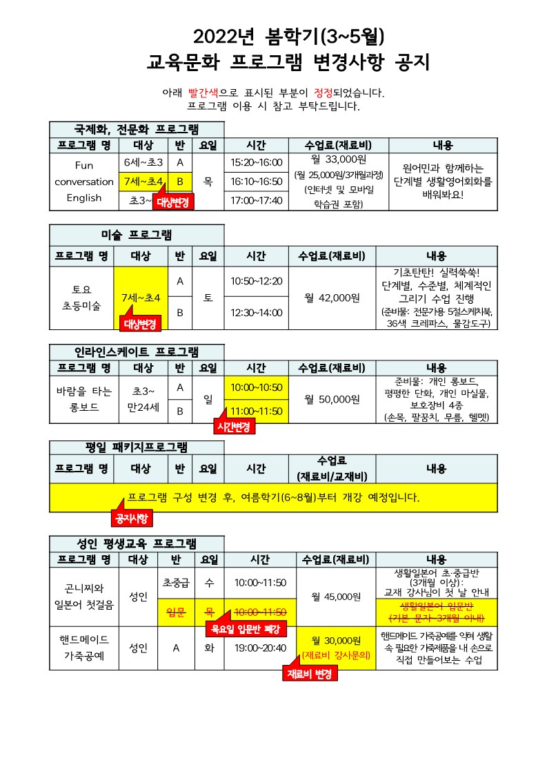 | º½Çбâ(3~5¿ù) ±³À°¹®ÈÇÁ·Î±×·¥ º¯°æ»çÇ× °øÁö (3.31.¼öÁ¤) | ||