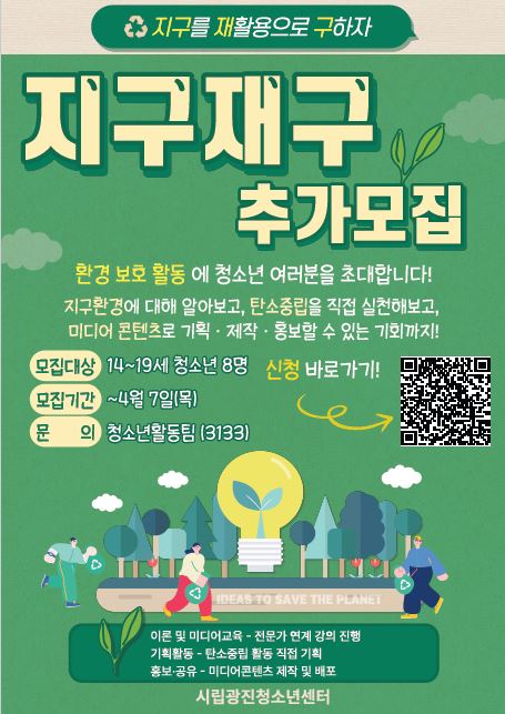 û¼Ò³â ºÀ»ç´Ü Áö±¸À籸 ´Ü¿øÀ» ¸ðÁýÇÕ´Ï´Ù. 'Áö±¸À籸'´Â ¶Ç·¡ û¼Ò³âµé°ú ÇÔ²² Áö±¸È¯°æ¿¡ ´ëÇØ ¾Ë¾Æº¸°í, ź¼ÒÁ߸³ Ȱµ¿À» ±âȹ¡¤ÁøÇࡤȫº¸ÇÏ´Â µ¿¾Æ¸®ÀÔ´Ï´Ù. ÇöÀç Áß¡¤°íµîÇлý 12¸í°ú ´ëÇлý ¸àÅä 5¸íÀÌ ÇÔ²²Çϰí ÀÖÀ¸¸ç , ȯ°æ¿¡ °ü½ÉÀÌ ÀÖ´Â ´©.±¸.³ª Áö¿ø °¡´ÉÇÕ´Ï´Ù ^-^ ¡Ý ´ë »ó : 14¼¼~19¼¼ ÀÌÇÏ Ã»¼Ò³â