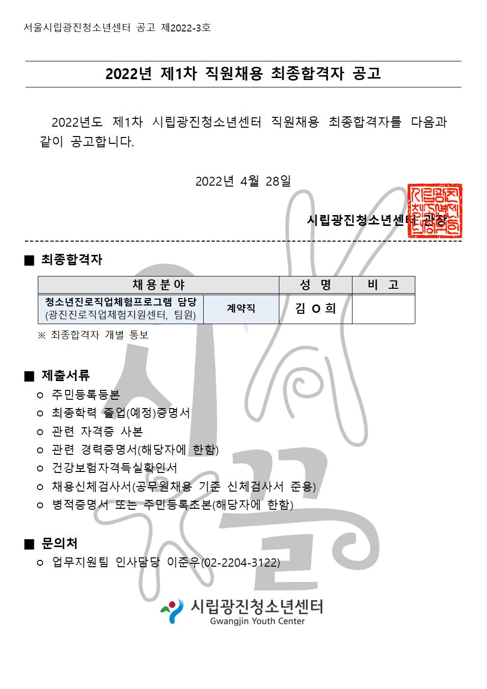 | [ä¿ë] ¼¿ï½Ã¸³±¤ÁøÃ»¼Ò³â¼¾ÅÍ Ã¤¿ë ÃÖÁ¾ÇÕ°ÝÀÚ °ø°í | ||