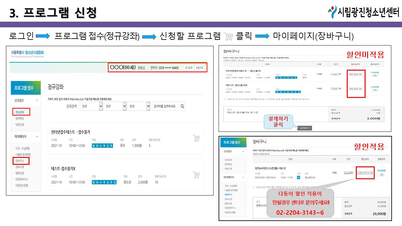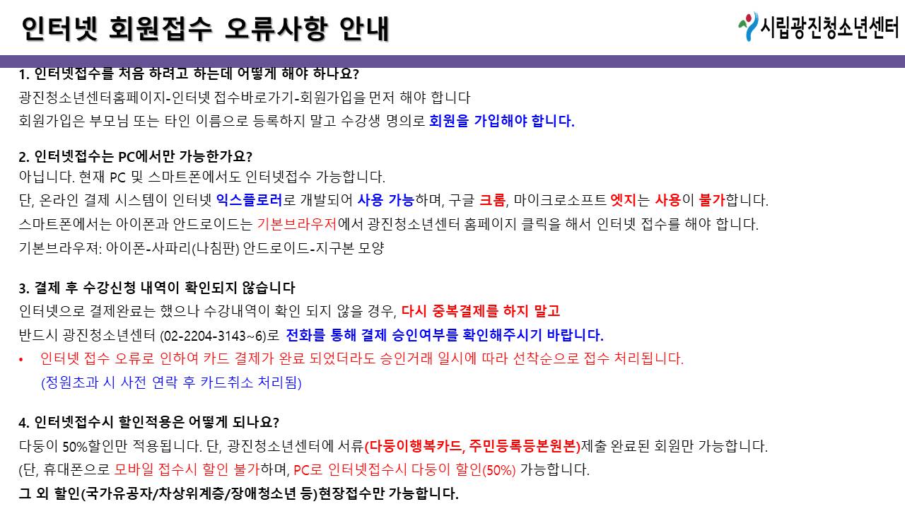 * Áß¿ä»çÇ× * 1) ¼ö°»ý À̸§À¸·Î ȸ¿ø°¡ÀÔ ÈÄ Á¢¼öÇʼö 2) Á¢¼ö ±â°£/½Ã°£ ³» ¹æ¹®Á¢¼ö ºÒ°¡ (ÀÎÅͳÝÁ¢¼ö¸¸ °¡´É) 3) °áÁ¦½Ã ÈÞ´ëÆù¹øÈ£ ÀԷ½à (-)Á¦¿Ü ÈÄ ¼ýÀÚ¸¸ ÀÔ·Â!!! (-) ÀԷ½à º»ÀÎÈ®ÀÎ ºÒ°¡ 4) ÀÎÅÍ³Ý Á¢¼ö ¿À·ù·Î ÀÎÇØ Ä«µå °áÁ¦°¡ ¿Ï·á µÇ¾ú´õ¶óµµ ¼±Âø¼øÀ¸·Î Á¢¼öó¸® (Á¤¿øÃʰú½Ã °³º° ¿¬¶ô ÈÄ Ä«µåÃë¼Ò 󸮵Ê) 5) °áÁ¦¹æ½Ä Áß SMS°áÁ¦´Â Á¢¼ö ºÒ°¡ 6)±¤ÁøÃ»¼Ò³â¼¾ÅÍ¿¡ ¼·ùÁ¦Ãâ ¿Ï·áµÈ ´ÙµÕÀ̰¨¸éÀÚ¸¸ ´ÙµÕÀÌ 50% ÇÒÀÎ Àû¿ëµË´Ï´Ù.(¿Â¶óÀÎÁ¢¼ö½Ã) ±× ¿Ü ÇÒÀÎ(±¹°¡À¯°øÀÚ, Â÷»óÀ§°èÃþ, Àå¾ÖÀÎ)û¼Ò³âÀº ÇöÀåÁ¢¼ö¸¸ °¡´ÉÇÏ´Ï Á¢¼ö½Ã Âü°í¹Ù¶ø´Ï´Ù.