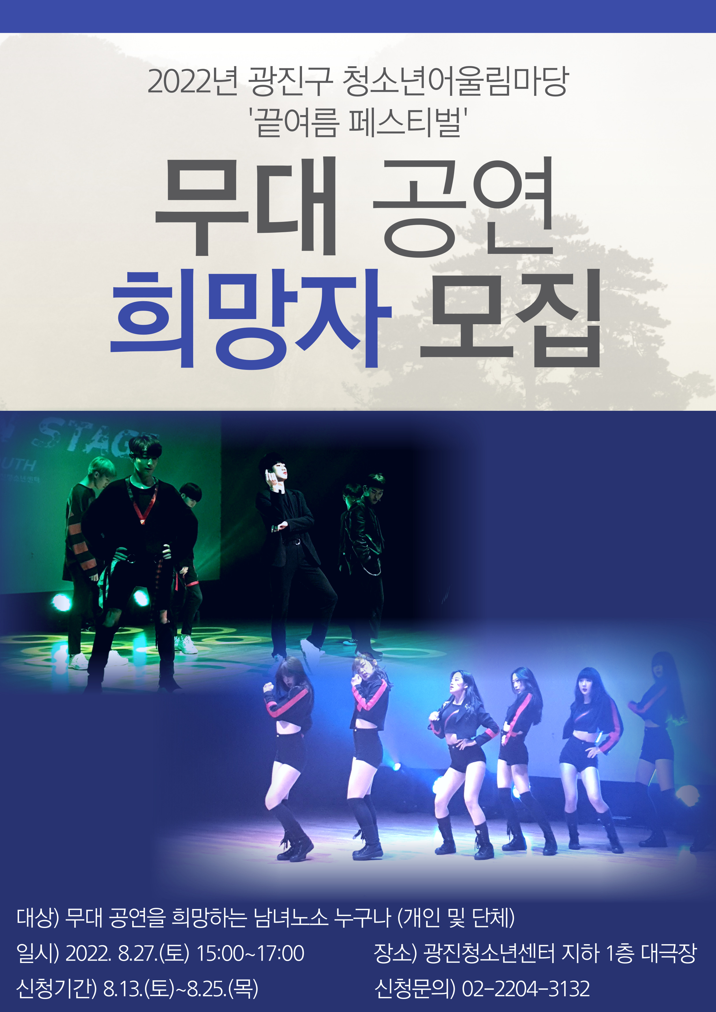 | 2022³â ±¤Áø±¸ û¼Ò³â¾î¿ï¸²¸¶´ç '³¡¿©¸§ Æä½ºÆ¼¹ú' ¹«´ë °ø¿¬ Èñ¸ÁÀÚ ¸ðÁý ¾È³» | |||