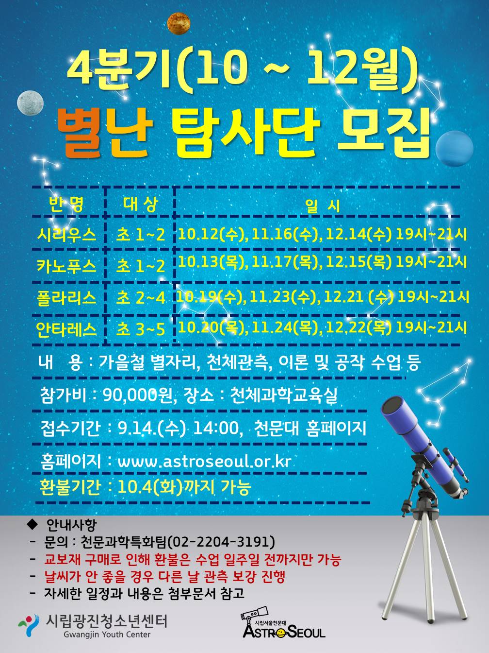 2022³â 4ºÐ±â(10~12¿ù) º°³Å½»ç´Ü Âü°¡ÀÚ ¸ðÁý ¾È³» 1. ¼ö¾÷ ÀÏÁ¤ ¹Ý¸í | ´ë»ó | ÀϽà | Âü°¡ºñ | Àå¼Ò | ½Ã¸®¿ì½º | ÃÊ1~2 | 10.12(¼ö), 11.16(¼ö), 12.14(¼ö) 19:00~21:00 | 90,000¿ø/ 3°³¿ù (Áغñ¹°: ¿¡ÄÚ¹é, Çʱ⵵±¸, ¹°Åë) | 4Ãþ õü°úÇб³À°½Ç | Ä«³ëǪ½º | ÃÊ1~2 | 10.13(¸ñ), 11.17(¸ñ), 12.14(¸ñ) 19:00~21:00 | Æú¶ó¸®½º | ÃÊ2~4 | 10.19(¼ö), 11.23(¼ö), 12.21(¼ö) 19:00~21:00 | ¾ÈŸ·¹½º | ÃÊ3~5 | 10.20(¸ñ), 11.24(¸ñ), 12.22(¸ñ) 19:00~21:00 |