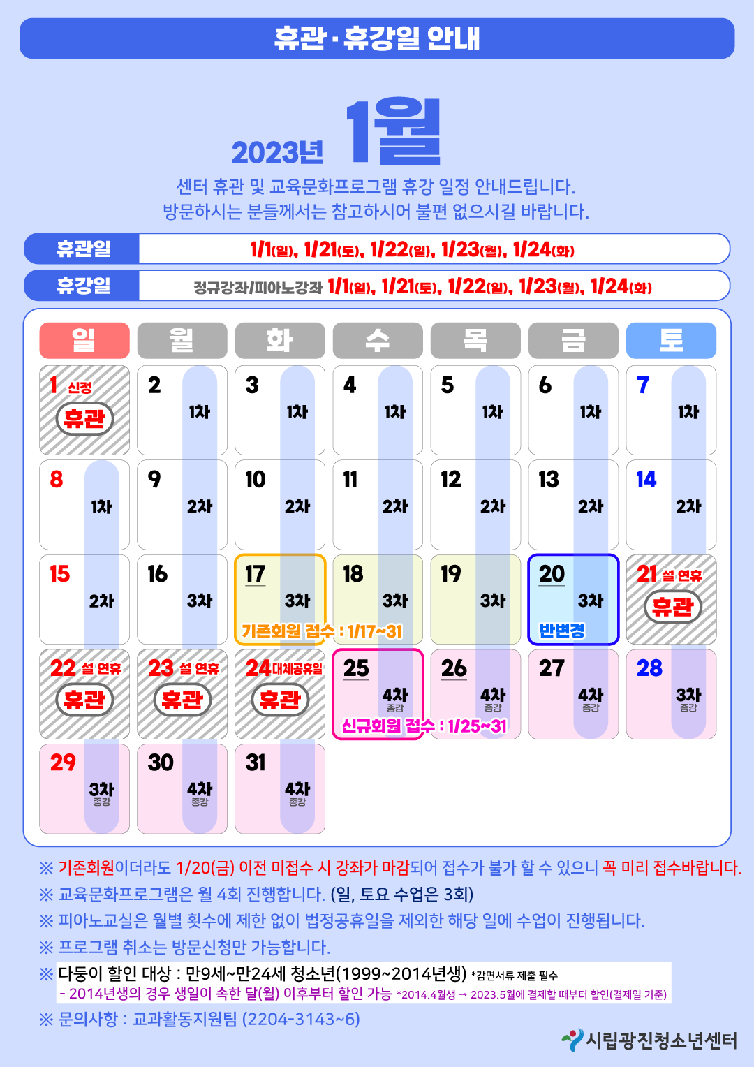 2. ÈÞ°ÀÏ : ¡Ü Á¤±Ô°Á 1/1(ÀÏ), 1/21(Åä), 1/22(ÀÏ), 1/23(¿ù), 1/24(È) ¡Ü ÇǾƳë°Á 1/1(ÀÏ), 1/21(Åä), 1/22(ÀÏ), 1/23(¿ù), 1/24(È)
