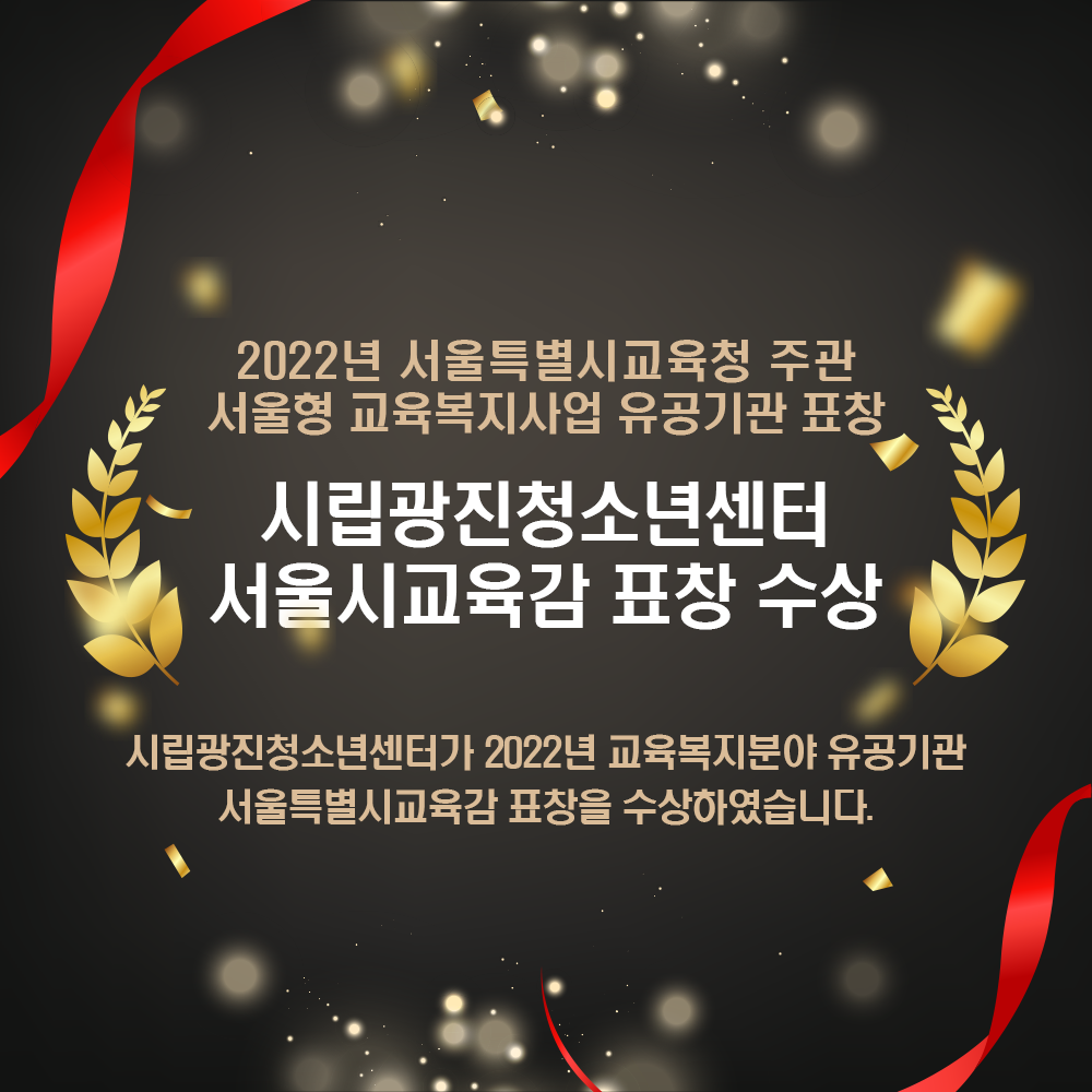 | ±¤ÁøÃ»¼Ò³â¼¾ÅÍ 2022³â ¼¿ïƯº°½Ã±³À°Ã» ÁÖ°ü ¼¿ïÇü ±³À°º¹Áö»ç¾÷ À¯°ø±â°ü ¼¿ï½Ã±³À°°¨ ǥâ ¼ö»ó | ||