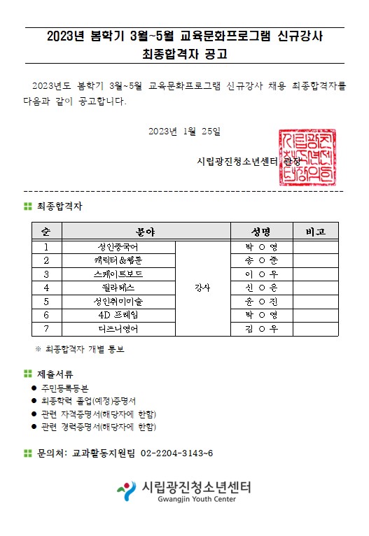 | [°»çä¿ëÇÕ°ÝÀÚ°ø°í] 2023³â º½Çбâ 3¿ù~5¿ù ±³À°¹®ÈÇÁ·Î±×·¥ °»ç ä¿ë ÃÖÁ¾ ÇÕ°ÝÀÚ °ø°í | ||
