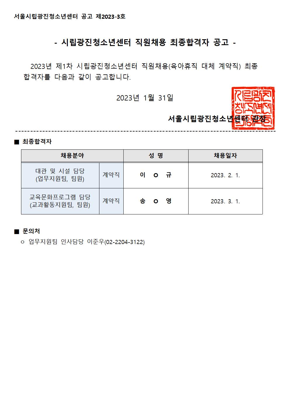 | [ä¿ë] 2023³â Á¦1Â÷ Á÷¿øÃ¤¿ë ÃÖÁ¾ÇÕ°ÝÀÚ °ø°í | ||