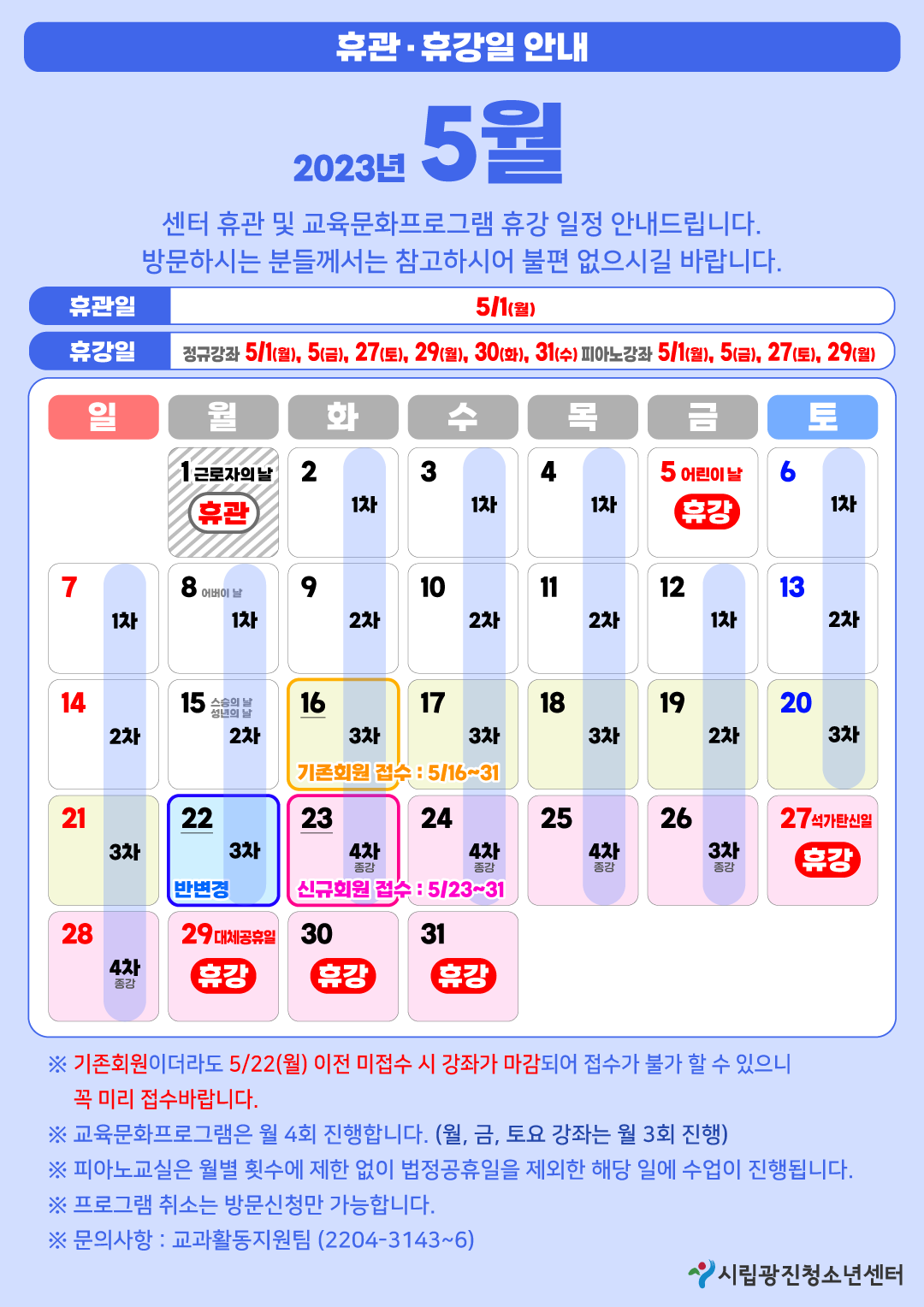 2023³â 5¿ù ÈÞ°üÀÏ, ÈÞ°ÀÏ ¾È³» ¼¾ÅÍ ÈÞ°ü ¹× ±³À°¹®È°Á ÈÞ° ÀÏÁ¤À» ¾È³»µå¸®¿À´Ï ¹æ¹®ÇϽô ºÐµé²²¼´Â Âü°íÇÏ½Ã¾î ºÒÆí ¾øÀ¸½Ã±æ ¹Ù¶ø´Ï´Ù.
