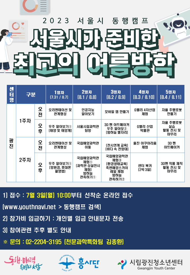 1. ÀϽà - 1ÁÖÂ÷: 7. 31.(¿ù) ~ 8. 4.(±Ý) 10:00~17:00 - 2ÁÖÂ÷: 8. 7.(¿ù) ~ 8. 11.(±Ý) 10:00~17:00 / 8.8.(È)~8.10.(¸ñ) 2¹Ú3ÀÏ Ä·ÇÁ ÁøÇà 2. Àå¼Ò - 1ÁÖÂ÷: ½Ã¸³±¤ÁøÃ»¼Ò³â¼¾ÅÍ, ½Ã¸³¼¿ï°úÇаü, G¹ë¸® ޹æ - 2ÁÖÂ÷: ½Ã¸³±¤ÁøÃ»¼Ò³â¼¾ÅÍ, ±¹¸³Çؾç°úÇаü, ¿ïÁø¾ÆÄí¾Æ¸®¿ò 3. ´ë»ó - ÃÊ 4Çгâ ~ Áß 2Çгâ 4. ÇÁ·Î±×·¥ - 1ÁÖÂ÷: õ¹®±³À°(žç, Ç༺, º°ÀÚ¸®), 4Â÷»ê¾÷±³À°(ÀΰøÁö´É, IOT µî) - 2ÁÖÂ÷: õ¹®±³À°(õü°üÃø), ÇØ¾ç»ýű³À°