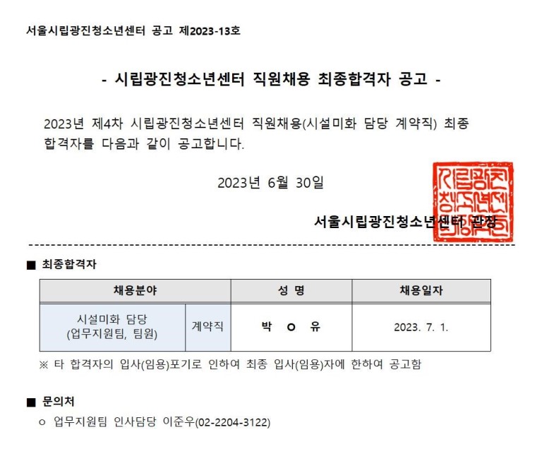 | [ü¿ë] ½Ã¸³±¤ÁøÃ»¼Ò³â¼¾ÅÍ Á÷¿øÃ¤¿ë ÃÖÁ¾ÇÕ°ÝÀÚ °ø°í(½Ã¼³¹ÌÈ ´ã´ç, °è¾àÁ÷) | ||