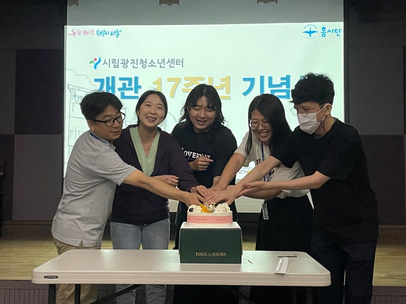 <½Ã¸³±¤ÁøÃ»¼Ò³â¼¾ÅÍ Á¦17Áֳ⠱â³äÇϱâ À§ÇØ Á÷¿øµéÀÌ ±â³ä ÄÉÀÍÀ» ÀÚ¸£°í ÀÖ´Ù>