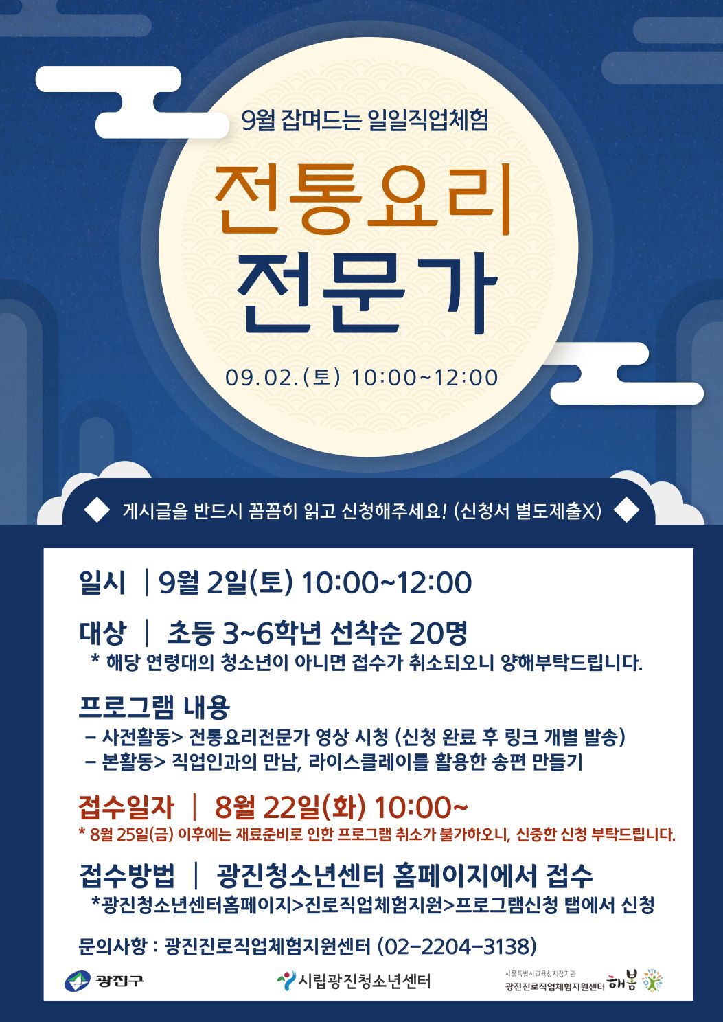 Àâ¸çµå´Â ÀÏÀÏÁ÷¾÷üÇè (8/22(È) ¿ÀÀü10:00~ ¼±Âø¼ø Á¢¼ö¿¹Á¤) - 9¿ùÀÇ Á÷¾÷ : ÀüÅë¿ä¸®Àü¹®°¡ ¡ÛÀϽà : 9¿ù 2ÀÏ(Åä) 10:00~12:00 ¡ÛÀå¼Ò : ±¤ÁøÃ»¼Ò³â¼¾ÅÍ(´ë¸é) ¡Û´ë»ó : Ãʵî 3~6Çгâ 20¸í ¡Û³»¿ë : ÀüÅë¿ä¸®Àü¹®°¡¿ÍÀÇ ¸¸³², ¶óÀ̽ºÅ¬·¹À̸¦ Ȱ¿ëÇÑ ¼ÛÆí ¸¸µé±â ¡ÛÁ¢¼öÀÏÀÚ : 8¿ù 22ÀÏ(È) 10:00~ ¡ÛÁ¢¼ö¹æ¹ý : https://www.seekle.or.kr/sub06/sub04_view.php?p_id=266&page=1& ¡Û±âŸ¾È³»: Ãë¼Ò ½Ã, ¹Ýµå½Ã ´ã´çÀÚ¿¡°Ô ¿¬¶ô ºÎʵ右´Ï´Ù. (02-2204-3138) À§ ½Åû¸µÅ© ³» °Ô½Ã±ÛÀ» ¹Ýµå½Ã Á¤µ¶ ÈÄ ½Åû ºÎʵ右´Ï´Ù! °Ô½Ã±ÛÀ» ÀÐÁö ¾Ê°í ¹ß»ýÇÏ´Â ºÒÀÌÀÍÀº Ã¥ÀÓÁöÁö ¾Ê½À´Ï´Ù😥