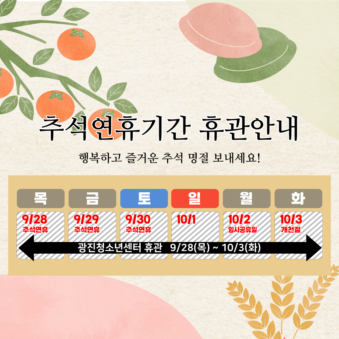 | Ãß¼®¿¬ÈޱⰣ ¼¾ÅÍ ÈÞ°ü ¾È³»(9/28~10/3) | ||
