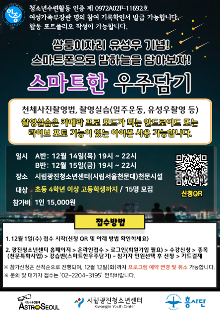 ¾È³çÇϼ¼¿ä, ½Ã¸³¼¿ïõ¹®´ëÀÔ´Ï´Ù. 12¿ù 14ÀÏ(¸ñ), 15ÀÏ(±Ý) ½ÖµÕÀÌÀÚ¸® À¯¼º¿ì ±Ø´ë±â°¡ ÀÖ¾î, ½º¸¶Æ®ÆùÀ¸·Î õü»çÁø ÃÔ¿µÀ» µµÀü ÇØº¼ ¼ö ÀÖ´Â ½Ã°£ÀÌ ¸¶·ÃµÇ¾ú½À´Ï´Ù. ½º¸¶Æ®ÇÑ ¿ìÁÖ´ã±â (½º¸¶Æ®ÆùÀ¸·Î õü»çÁøÃÔ¿µÇÏ´Â ÇÁ·Î±×·¥)ÀÌ ¾Æ·¡¿Í °°ÀÌ ¿î¿µµÊÀ» ¾Ë·Áµå¸³´Ï´Ù.