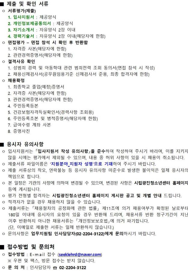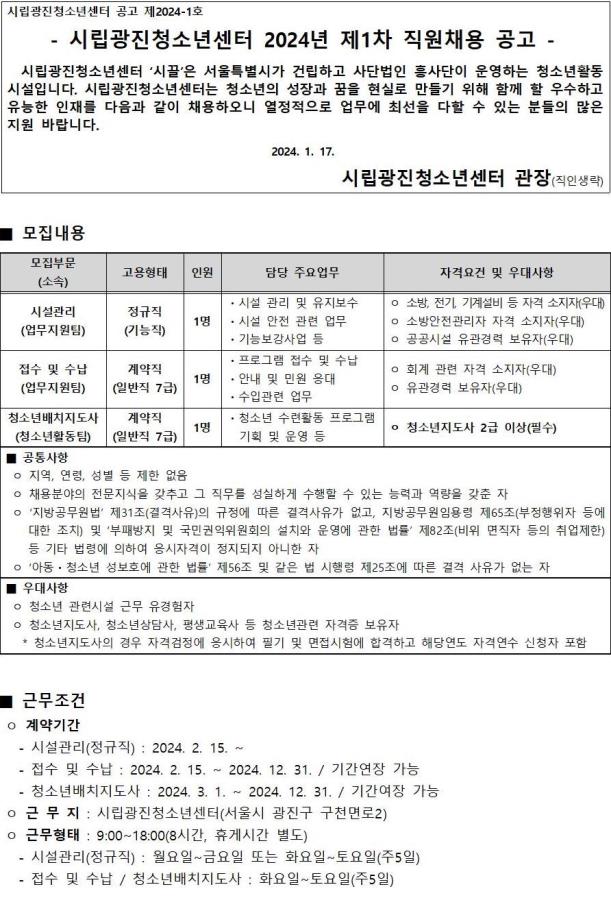 | [ä¿ë] ½Ã¸³±¤ÁøÃ»¼Ò³â¼¾ÅÍ Á÷¿øÃ¤¿ë(½Ã¼³°ü¸® / Á¢¼ö ¹× ¼ö³³ / û¼Ò³â¹èÄ¡Áöµµ»ç) | ||