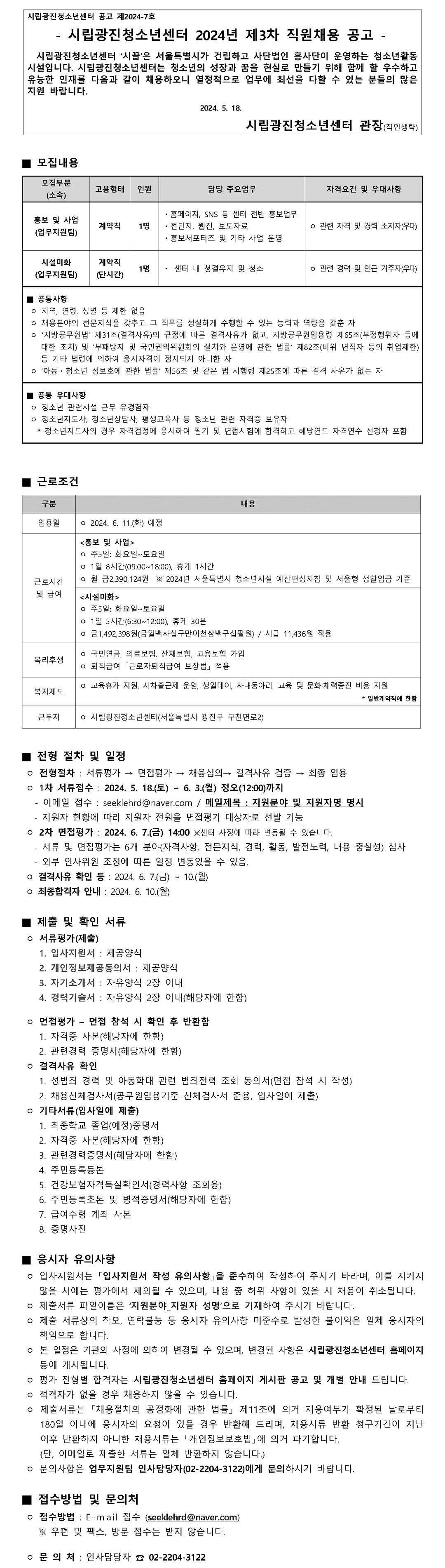 | 2024³â Á¦3Â÷ Á÷¿øÃ¤¿ë °ø°í(È«º¸ ¹× »ç¾÷ / ½Ã¼³¹ÌÈ) | ||