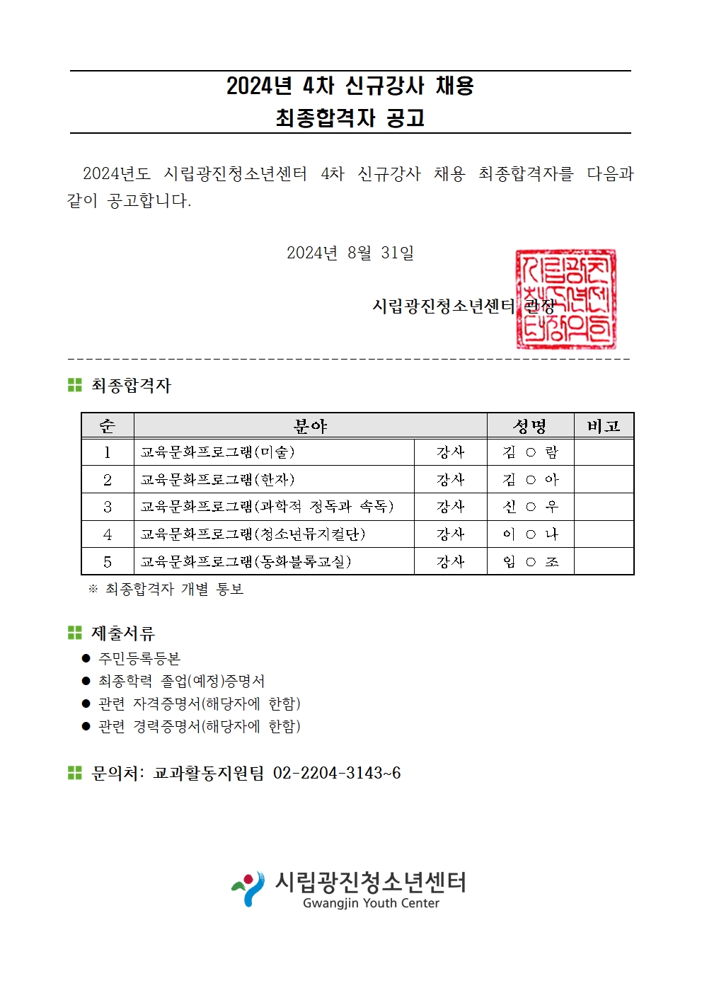 | [°»çä¿ëÇÕ°ÝÀÚ°ø°í] 2024³â 4Â÷ ½Å±Ô°»ç ä¿ë ÃÖÁ¾ ÇÕ°ÝÀÚ °ø°í | ||