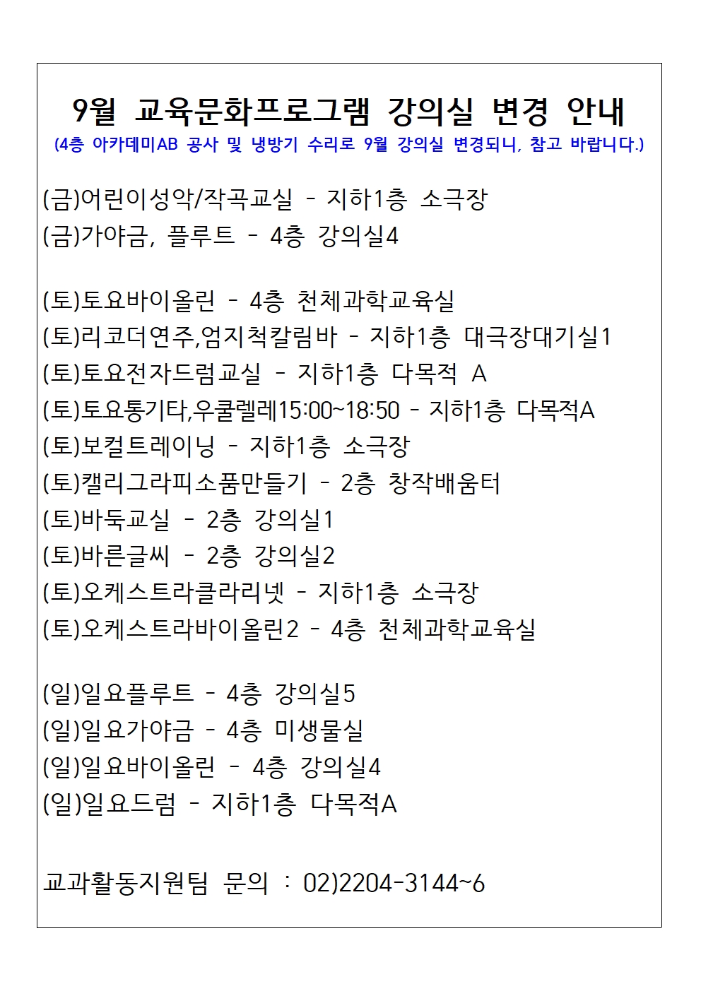 | [ °øÁö] ±³À°¹®ÈÇÁ·Î±×·¥ °ÀÇ½Ç º¯°æ¾È³» | ||