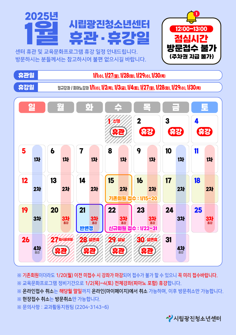 1. ÈÞ°üÀÏ : 1/1(¼ö), 1/27(¿ù), 1/28(È), 1/29(¼ö), 1/30(¸ñ) 2. ÈÞ°ÀÏ : Á¤±Ô°Á - 1/1(¼ö), 1/2(¸ñ), 1/3(±Ý), 1/4(Åä), 1/27(¿ù), 1/28(È), 1/29(¼ö), 1/30(¸ñ) ÇǾƳë°Á - 1/1(¼ö), 1/2(¸ñ), 1/3(±Ý), 1/4(Åä), 1/27(¿ù), 1/28(È), 1/29(¼ö), 1/30(¸ñ)