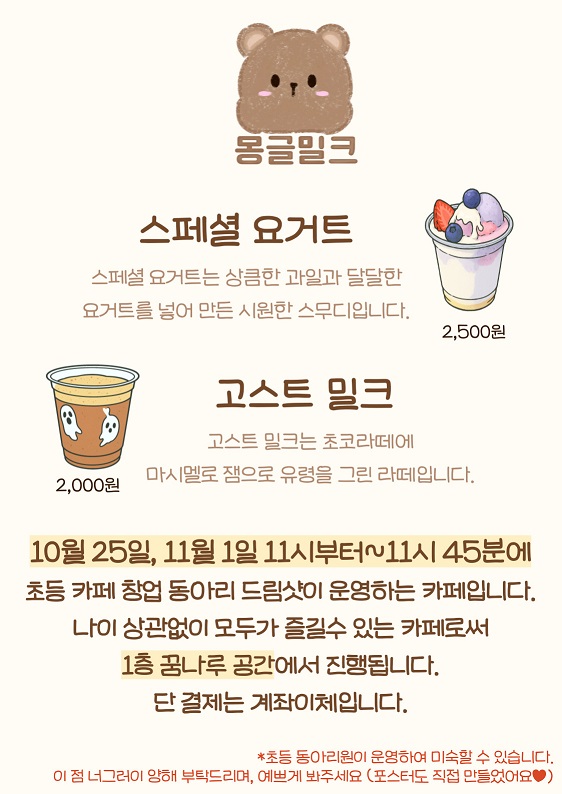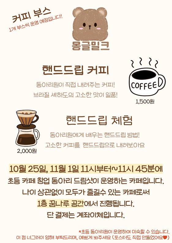 10¿ù 25ÀÏ, ±×¸®°í 11¿ù 1ÀÏ Åä¿äÀÏ 11½ÃºÎÅÍ 11½Ã 45ºÐ±îÁö 1Ãþ Ä«Æä°ø°£(²Þ³ª·ç °ø°£ ¾È)¿¡¼ 1ÀÏÄ«Æä¸¦ ¿î¿µÇÕ´Ï´Ù!