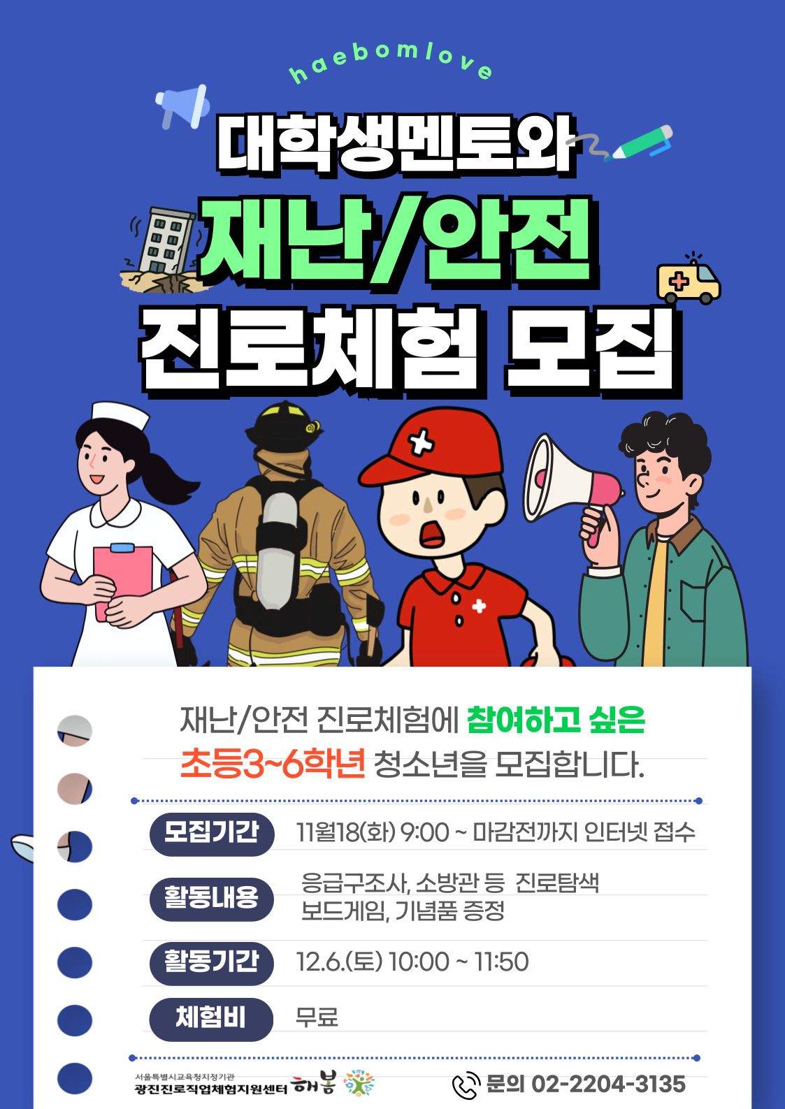¡ÛÀϽà : 12¿ù 6ÀÏ(Åä) 10:00~11:50 ¡Û´ë»ó : Ãʵî 3~6Çг⠡۳»¿ë : ´ëÇлý ¸àÅä¿Í Àç³/¾ÈÀü Áø·ÎüÇè ¡ÛÁ¢¼öÀÏÀÚ : 11¿ù 18ÀÏ(È) 09:00~ ¡ÛÁ¢¼ö¹æ¹ý : ¿Â¶óÀÎ ¼ö°½Åû ÆäÀÌÁö¸¦ ÀÌ¿ëÇÑ ¿Â¶óÀÎ Á¢¼ö (·Î±×ÀÎ Çʼö!) ¡Ú¼±Âø¼ø ¸¶°¨µÈ °æ¿ì, ¿Â¶óÀÎ ¼ö°½Åû ÆäÀÌÁö¿¡ ¶ßÁö ¾Ê½À´Ï´Ù😥