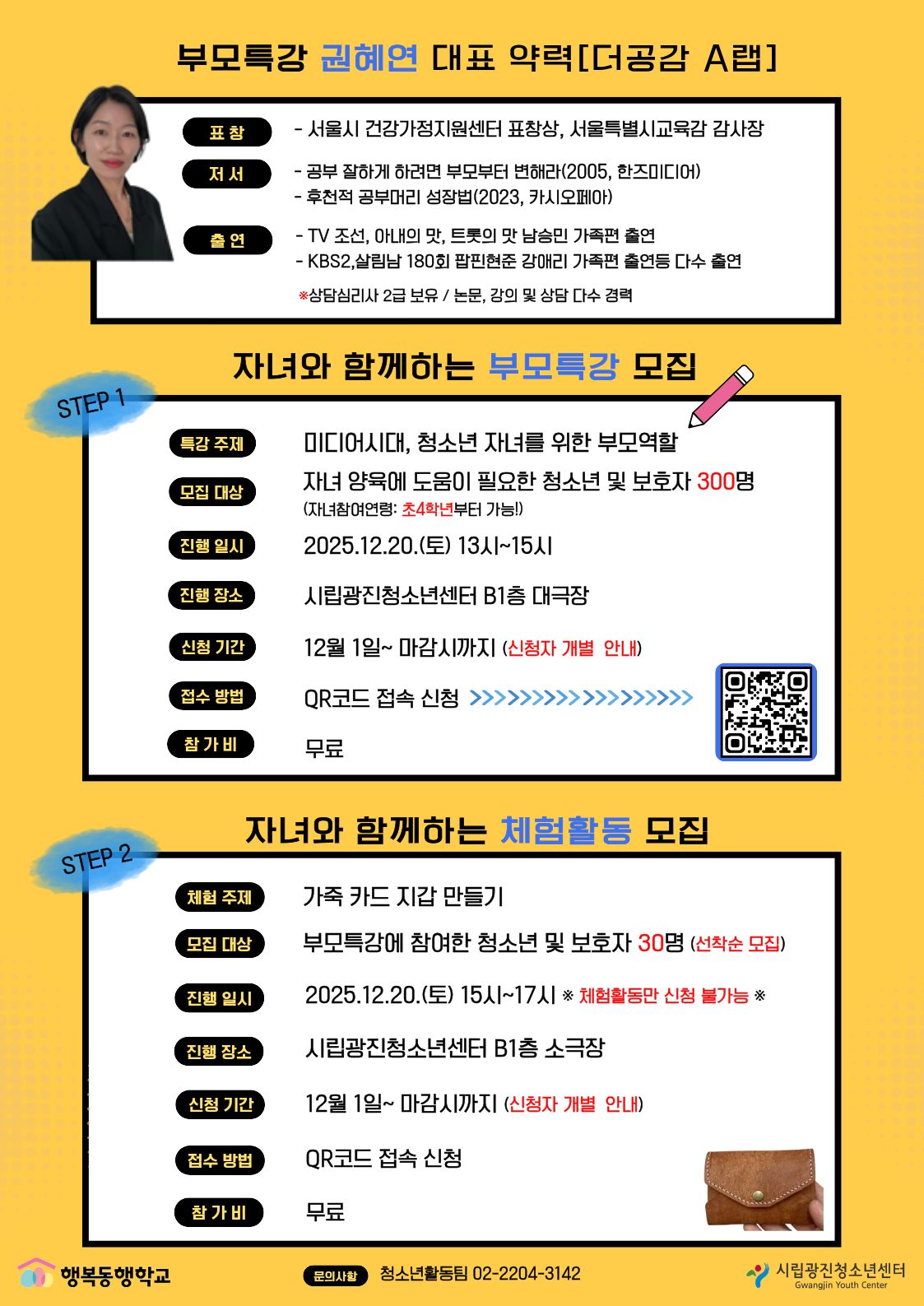- üÇè ÁÖÁ¦: °¡Á× Ä«µåÁö°© ¸¸µé±â - ¸ðÁý ´ë»ó: ºÎ¸ðƯ° Âü¿©ÀÚ Áß Ã»¼Ò³â ¹× º¸È£ÀÚ 30¸í (¼±Âø¼ø¸ðÁý!) - ÁøÇà ÀϽÃ: 2025. 12. 20.(Åä) 15:00 ~ 17:00 ¡Ø üÇèȰµ¿¸¸ ½ÅûÀº ºÒ°¡ÇÕ´Ï´Ù. - ÁøÇà Àå¼Ò: ½Ã¸³±¤ÁøÃ»¼Ò³â¼¾ÅÍ B1Ãþ ¼Ò±ØÀå - ½Åû ±â°£: 12¿ù 1ÀÏ ~ ¸¶°¨ ½Ã±îÁö (½ÅûÀÚ °³º° ¾È³») - Á¢¼ö ¹æ¹ý: QRÄÚµå Á¢¼Ó ½Åû - Âü°¡ºñ: ¹«·á
