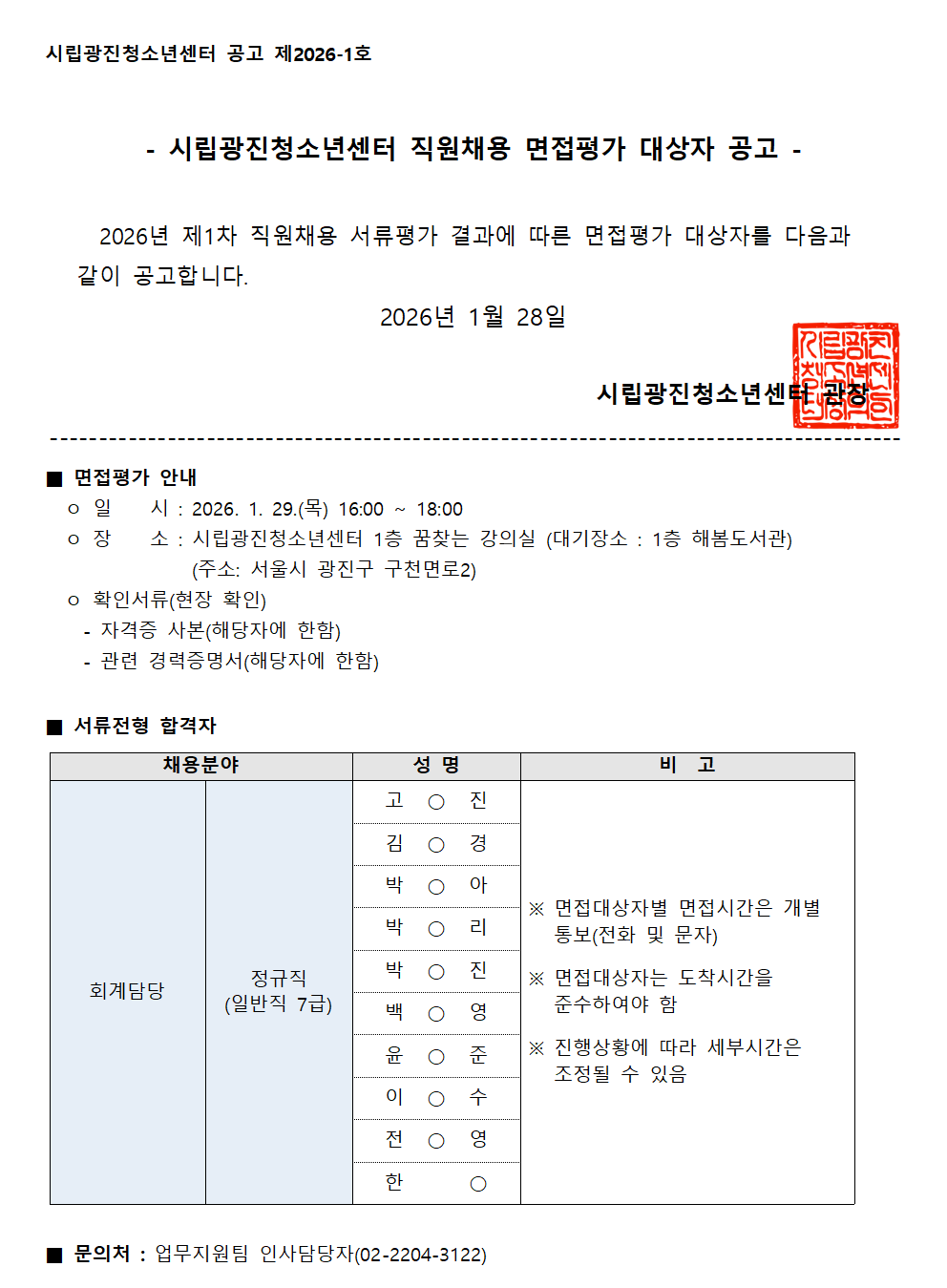 | [ä¿ë] Á¦1Â÷ Á÷¿øÃ¤¿ë(ȸ°è´ã´ç) ¼·ùÇÕ°ÝÀÚ °ø°í(¸éÁ¢ ´ë»óÀÚ ¾È³») | ||