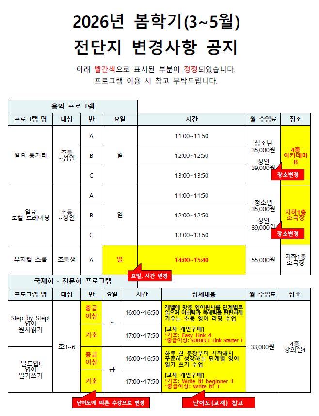 | [º¯°æ»çÇ× ¾È³»]2026³â º½Çбâ(3~5¿ù) ÇÁ·Î±×·¥ º¯°æ»çÇ× °øÁö(£³.1£³.±âÁØ) | ||