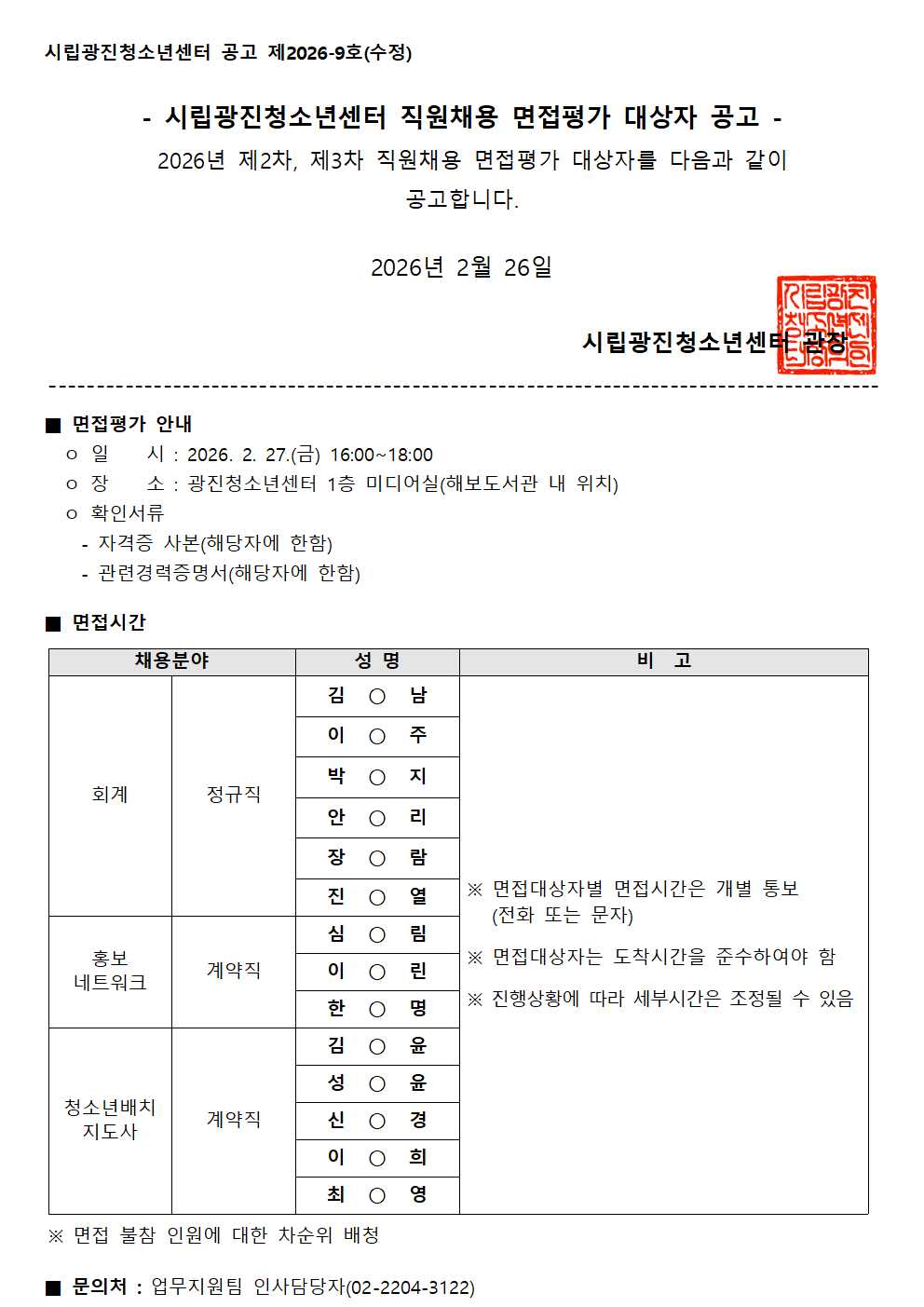 | [ä¿ë] 2026³â Á¦2Â÷, Á¦3Â÷ Á÷¿øÃ¤¿ë ¼·ùÇÕ°ÝÀÚ °ø°í_¼öÁ¤(¸éÁ¢ ´ë»óÀÚ ¾È³») | ||