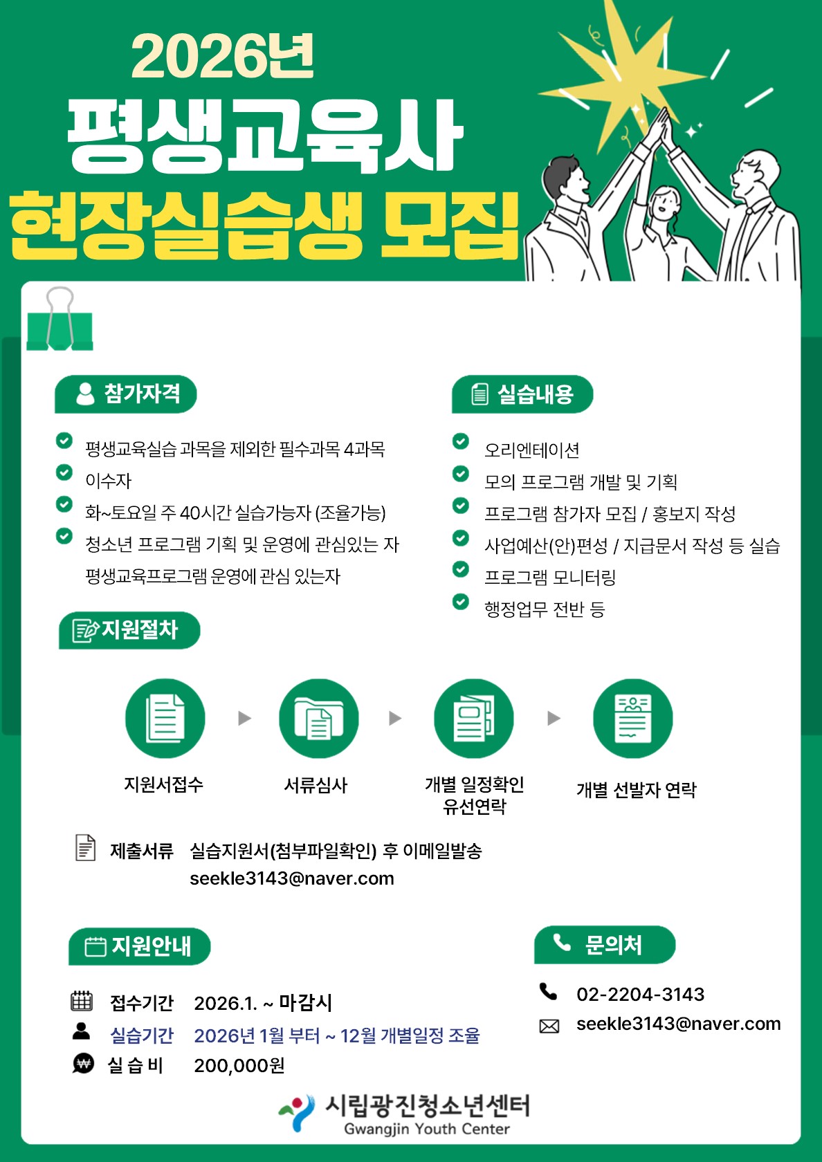 2026³â Æò»ý±³À°»ç ÇöÀå½Ç½À»ýÀ» ¸ðÁýÇÕ´Ï´Ù. - ½Åû±â°£ : 2026. 1. 20. ~ 2026. 12.31. ½Ç½ÀÁö¿ø¼ ÀÛ¼º ÈÄ À̸ÞÀÏ(seekle3143@naver.com)À¸·Î ½Åû - ½Ç½À±â°£ : 2026. 2.1. ~ 12.31. / 20ÀÏ 160½Ã°£ ( ¼·ù Á¦ÃâÇÏ¸é ½Ç½À´ã´çÀÚ°¡ À¯¼±¿¬¶ôÇÏ¿© °³ÀÏÀÏÁ¤ È®Àο¹Á¤À̳ª, ½Ç½ÀÁö¿ø¼¿¡ ½Ç½À°¡´É ÀÏÀÚ¸¦ Àû¾îº¸³»ÁÖ¼¼¿ä)