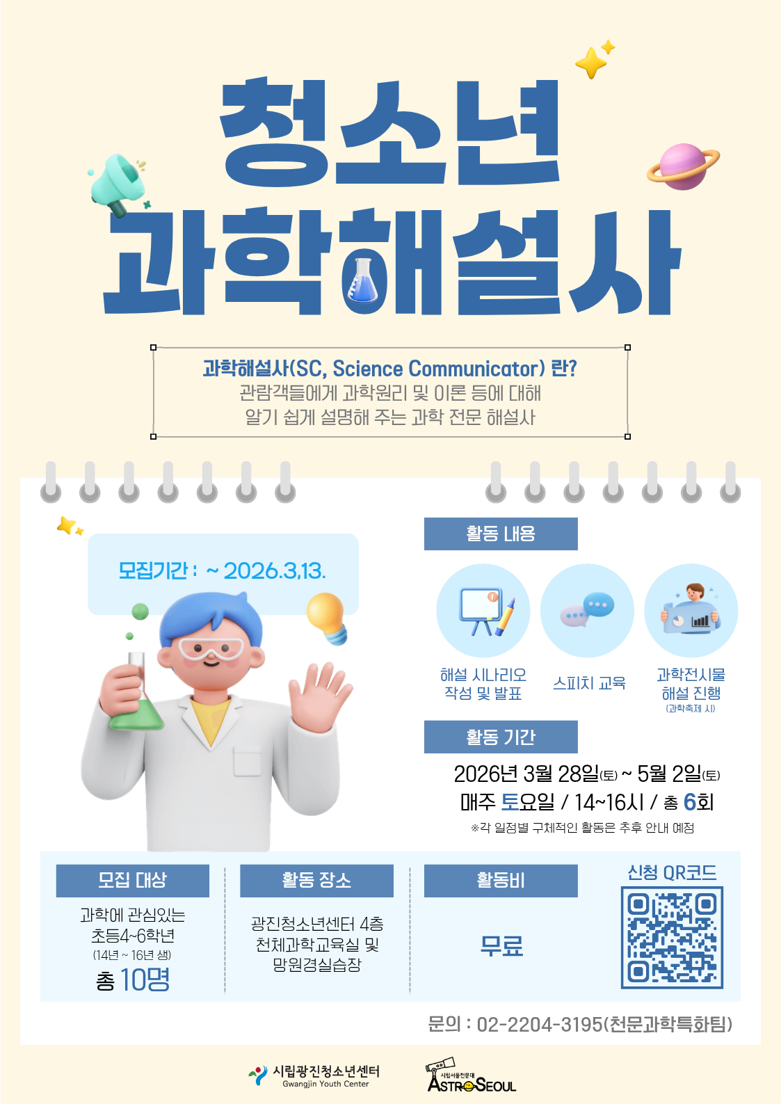 📢 ±¹¸³°úõ°úÇаü À̵¿Çü °úÇÐ Àü½Ã¹°À» Ȱ¿ëÇÑ °úÇÐÄ¿¹Â´ÏÄÉÀÌ¼Ç È°µ¿À» ÇÔ²² ÇÏ°í ½ÍÀº û¼Ò³â°úÇÐÇØ¼³»ç¸¦ ¸ðÁýÇÕ´Ï´Ù. 🔎 °úÇÐÇØ¼³»ç¶õ? °ü¶÷°´µé¿¡°Ô °úÇпø¸® ¹× ÀÌ·Ð µî¿¡ ´ëÇØ ¾Ë±â ½±°Ô ¼³¸íÇØÁÖ´Â °úÇÐ Àü¹® ÇØ¼³»ç 📅 Ȱµ¿ ¾È³» Ȱµ¿±â°£ : 2026³â 3¿ù 28ÀÏ(Åä)~5¿ù 2ÀÏ(Åä) ¸ÅÁÖ Åä¿äÀÏ 14½Ã~16½Ã(ÃÑ 6ȸ) ¡Ø°¢ ÀÏÁ¤º° ±¸Ã¼ÀûÀÎ ½Ã°£Àº ÃßÈÄ ¾È³» ¿¹Á¤ 📌 Ȱµ¿Àå¼Ò: ±¤ÁøÃ»¼Ò³â¼¾ÅÍ 4Ãþ õü°úÇб³À°½Ç ¹× ¸Á¿ø°æ½Ç½ÀÀå 📌 ¸ðÁý´ë»ó °úÇÐÀ» ÁÁ¾ÆÇÏ´Â 2014³â~2016³â»ý (ÃÊ4~6) 📌 ¸ðÁýÁ¤¿ø :10¸í 📌 Ȱµ¿ºñ: ¹«·á 📝 ÁÖ¿ä Ȱµ¿ ³»¿ë - ±¹¸³°úõ°úÇаü À̵¿Çü Àü½Ã¹°À» Ȱ¿ëÇÑ °úÇÐÄ¿¹Â´ÏÄÉÀÌ¼Ç ±³À° - ÇØ¼³ ½Ã³ª¸®¿À Á¦ÀÛ - ¼³¸í¹ý ¹× Àü´Þ·Â ÈÆ·Ã - °³Àκ° Àü½Ã¹° ½ºÅ©¸³Æ® ¹ßÇ¥ - °úÇÐÃàÁ¦ ±â°£(5¿ù 2ÀÏ) ÇØ¼³»ç ½ÇÀü ½Ã¿¬ 📌 ½Åû¹æ¹ý: ±¸±ÛÆû Á¢¼ö(QR) / ÇÕ°ÝÀÚ´Â °³Àזּôµå¸³´Ï´Ù. 📌 Á¢¼ö±â°£: 2¿ù 20ÀÏ(±Ý)~3¿ù 13ÀÏ(±Ý) 📞 ¹®ÀÇ: 02-2204-3195(õ¹®°úÇÐÆ¯ÈÆÀ)