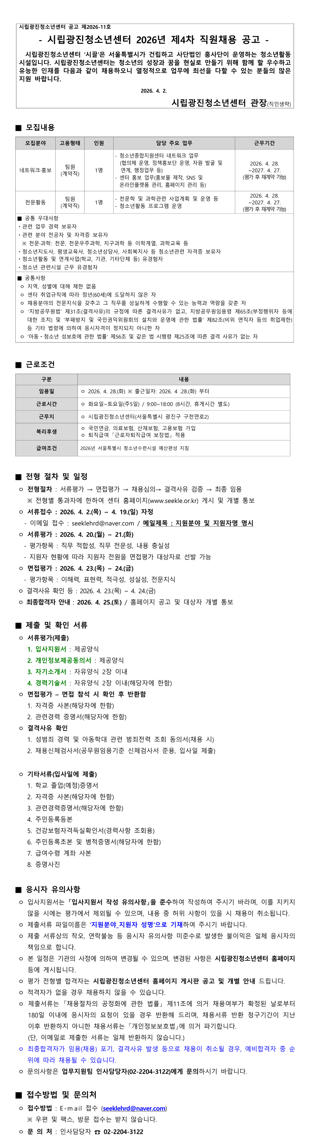 | [ä¿ë°ø°í] ±¤ÁøÃ»¼Ò³â¼¾ÅÍ Á÷¿ø ä¿ë(³×Æ®¿öÅ©¡¤È«º¸ ´ã´ç 1¸í / õ¹®È°µ¿ ´ã´ç 1¸í) | ||