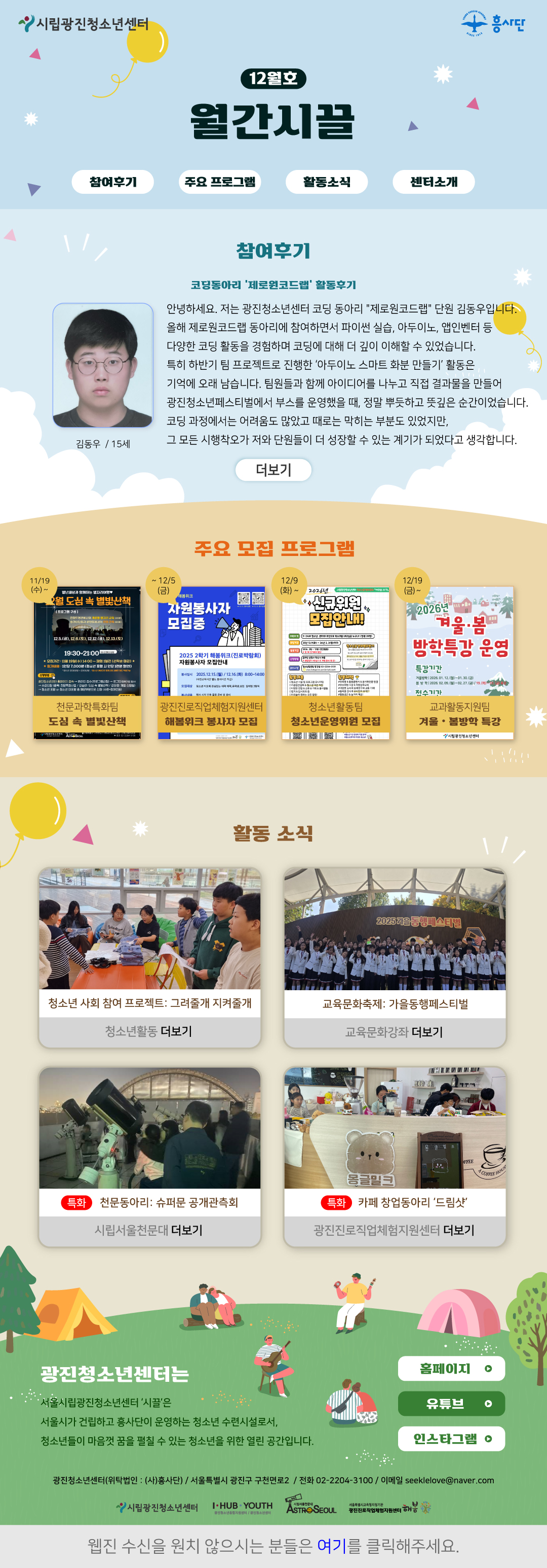 | ÀÛ¼ºÀÚ : ±¤ÁøÃ»¼Ò³â¼¾ÅÍ(seeklelove@naver.com) ÀÛ¼ºÀÏ : 2025-12-04 Á¶È¸¼ö : 164 | ||