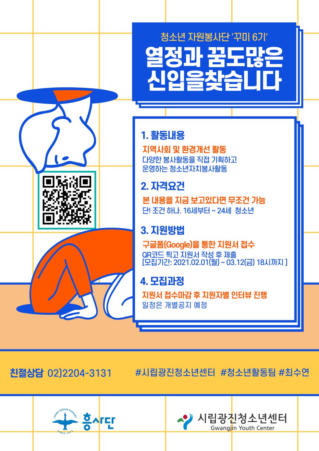 ¡Û Ȱµ¿°³¿ä °¡. Ȱµ¿±â°£ : 2021³â 3¿ù ~ 12¿ù / ¿¬Áß ³ª. ¸ðÁý±â°£ : 2021³â 2¿ù 1ÀÏ(¿ù) ~ 3¿ù 12ÀÏ(±Ý) 18½Ã±îÁö ´Ù. Áö¿ø´ë»ó : 16¼¼~24¼¼ û¼Ò³â, 15¸í ¶ó. Ȱµ¿³»¿ë : ºÀ»çȰµ¿ ±âȹȸÀÇ, Áö¿ª»çȸ ¹× ȯ°æ ºÀ»çȰµ¿, ±³·ùȰµ¿ µî ¸¶. ÁøÇàÀå¼Ò : ½Ã¸³±¤ÁøÃ»¼Ò³â¼¾ÅÍ ³»¡¤¿Ü ¹× ¿Â¶óÀÎÇ÷§Æû ¹Ù. Âü°¡ºñ¿ë : ¾øÀ½ ¡Û ¼¼ºÎ ºÀ»çȰµ¿ - Áö¿ªÈ¯°æ°³¼±È°µ¿ - Àç´ÉºÀ»çȰµ¿(¸¸µé±â, °ø¿¬ µî) - Ä·ÆäÀÎ ¹× ȯ°æº¸È£È°µ¿ (ȯ°æº¸È£, »çȸÀû À̽´¾Ë¸®±â µî) - À¯±â°ß ºÀ»çȰµ¿(Ä·ÆäÀÎ, º¸È£¼Ò¹æ¹® µî) - ±³À°ºÀ»çȰµ¿(¸àÅ丵, ÇнÀÁö¿ø µî) - ³ë·ÂºÀ»çȰµ¿(Àϼյ½±â, ¿¬ÅººÀ»ç µî) - ±âŸ ´Ù¾çÇÑ ºÀ»çȰµ¿ ÁøÇà