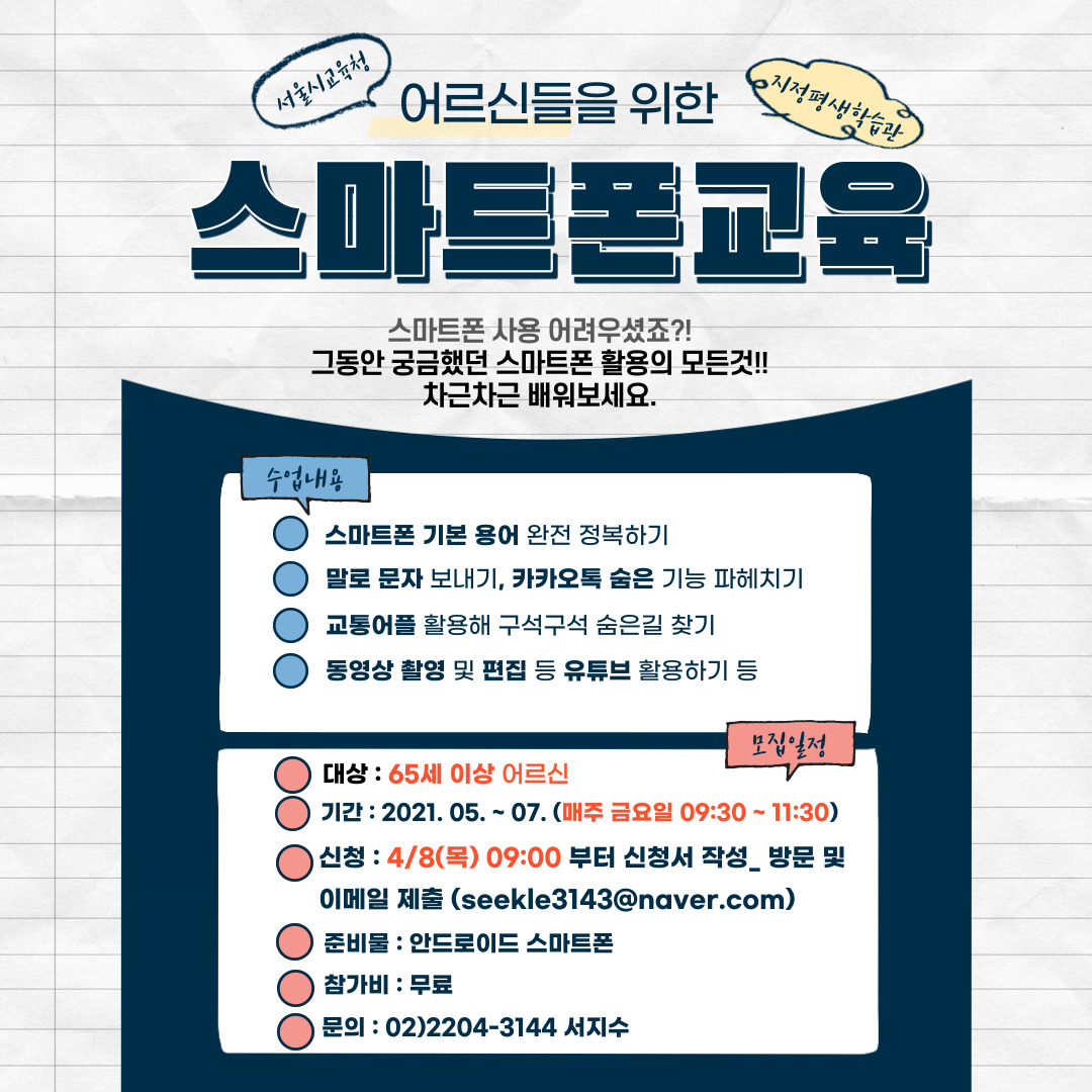 | [±³°ú] ÁöÁ¤Æò»ýÇнÀ°ü '¾î¸£½ÅµéÀ»À§ÇÑ ½º¸¶Æ®Æù±³À°" ¸ðÁý ¾È³» | ||