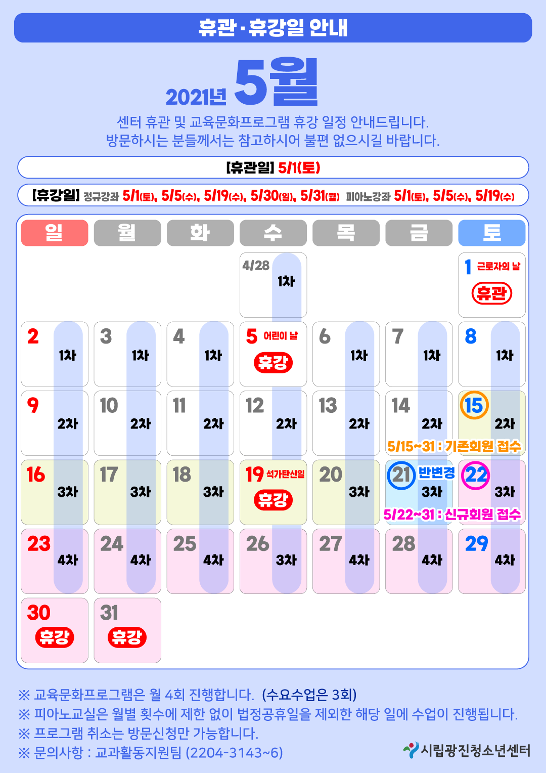 <°Á ÈÞ°ÀÏ> - Á¤±Ô °Á : 5/1(Åä), 5/5(¼ö), 5/19(¼ö), 5/30(ÀÏ), 5/31(¿ù) - ÇÇ¾Æ³ë °Á : 5/1(Åä), 5/5(¼ö), 5/19(¼ö)