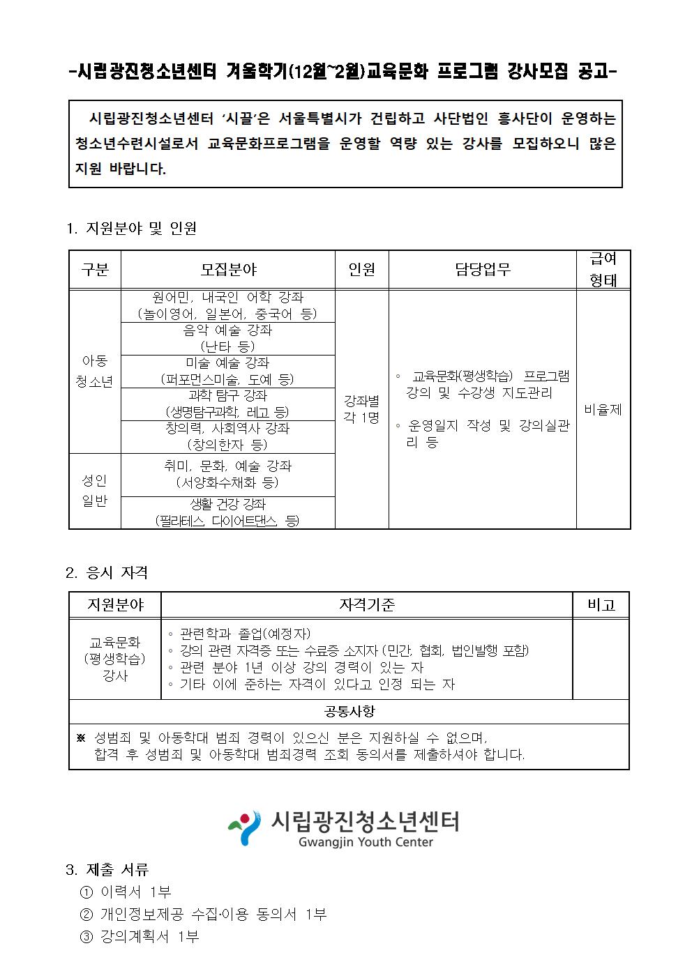 | ±¤ÁøÃ»¼Ò³â¼¾ÅÍ °Ü¿ïÇбâ(12~2¿ù) ±³À°¹®È ÇÁ·Î±×·¥ °»ç¸ðÁý °ø°í | ||