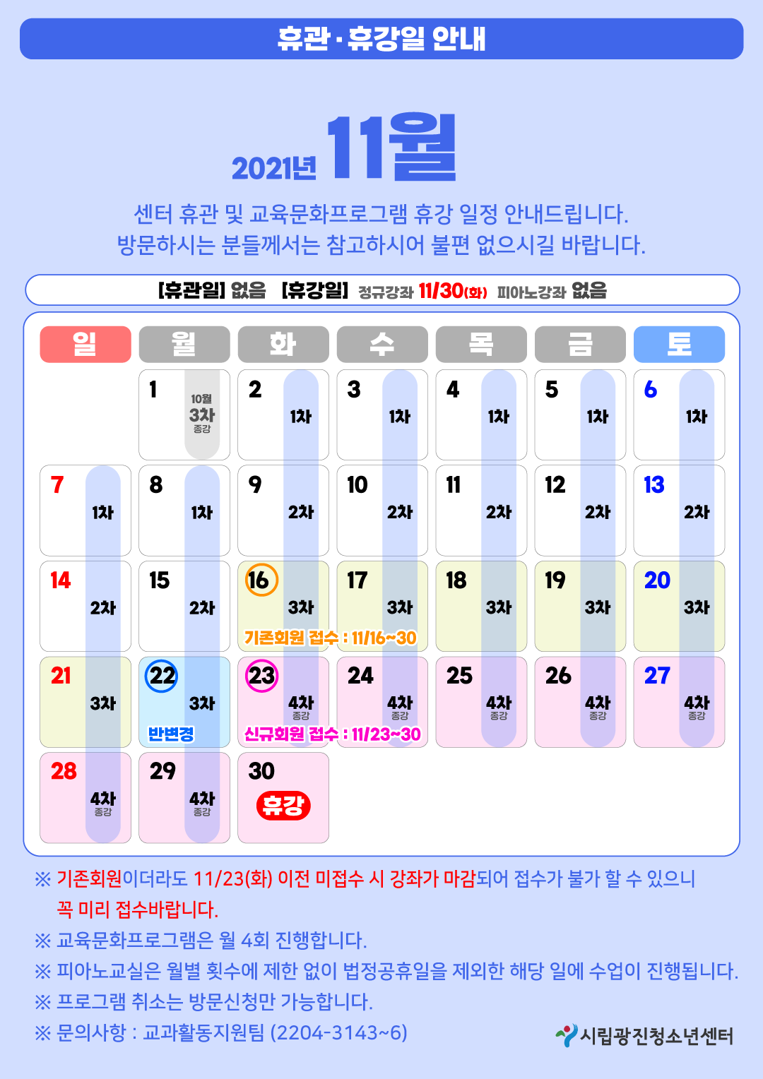 ¡Ø ±âÁ¸È¸¿øÀÌ´õ¶óµµ 11/23(È) ÀÌÀü ¹ÌÁ¢¼ö ½Ã °Á°¡ ¸¶°¨µÇ¾î Á¢¼ö°¡ ºÒ°¡ ÇÒ ¼ö ÀÖÀ¸´Ï ²À ¹Ì¸® Á¢¼ö¹Ù¶ø´Ï´Ù. ¡Ø ±³À°¹®ÈÇÁ·Î±×·¥Àº ¿ù 4ȸ ÁøÇàÇÕ´Ï´Ù. ¡Ø ÇǾƳ뱳½ÇÀº ¿ùº° Ƚ¼ö¿¡ Á¦ÇÑ ¾øÀÌ ¹ýÁ¤°øÈÞÀÏÀ» Á¦¿ÜÇÑ ÇØ´ç ÀÏ¿¡ ¼ö¾÷ÀÌ ÁøÇàµË´Ï´Ù. ¡Ø ÇÁ·Î±×·¥ Ãë¼Ò´Â ¹æ¹®½Åû¸¸ °¡´ÉÇÕ´Ï´Ù. ¡Ø ¹®ÀÇ»çÇ× : ±³°úȰµ¿Áö¿øÆÀ (2204-3143~6)