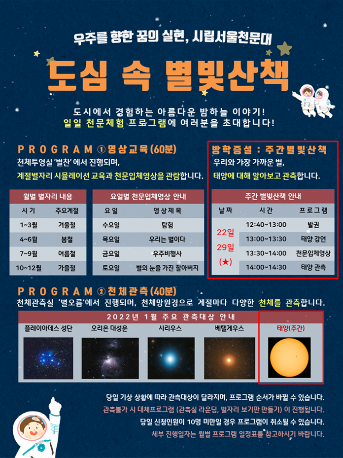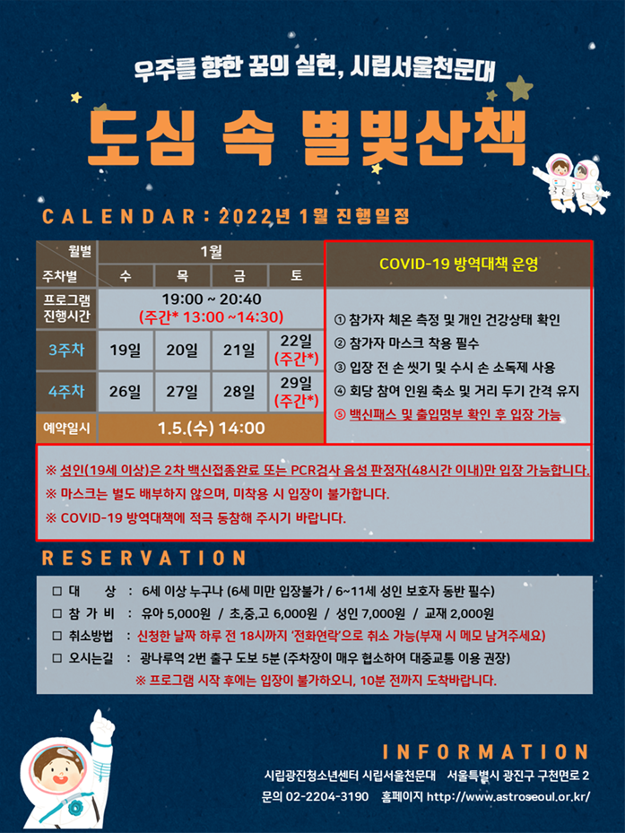 ¾È³çÇϼ¼¿ä, ½Ã¸³¼¿ïõ¹®´ëÀÔ´Ï´Ù. 2022³â 1¿ù µµ½É ¼Ó º°ºû»êÃ¥ ÇÁ·Î±×·¥ÀÌ ¾Æ·¡¿Í °°ÀÌ ¿î¿µµÊÀ» ¾Ë·Áµå¸³´Ï´Ù. ¸ðÁý ¿¹¾àÀº 1.5.(¼ö) 14:00ºÎÅÍ ¼±Âø¼øÀ¸·Î ÁøÇàµÇ¸ç, ¸ðÁý ÀοøÀº ¼¿ï½Ã ¹æ¿ªÁöħ¿¡ µû¶ó Á¤¿øÀÌ °¨¼ÒµÇ¾î ÁøÇàµË´Ï´Ù. ¡Ø»çȸÀû °Å¸®µÎ±â ´Ü°è °Ý»ó ½Ã, À§ ÇÁ·Î±×·¥Àº Ãë¼ÒµÉ ¼ö ÀÖ½À´Ï´Ù.