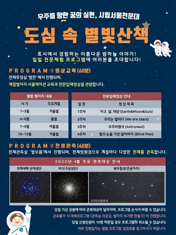 [º°ºû»êÃ¥ ¸ðÁý¹æ¹ý ¾È³»] 1. 3¿ù 16ÀÏ(¼ö) 14½Ã¿¡ ½Ã¸³¼¿ïõ¹®´ë ȨÆäÀÌÁö °øÁö»çÇ׿¡ »õ·Î¿î °øÁö±ÛÀÌ °Ô½ÃµË´Ï´Ù. ½Ã¸³¼¿ïõ¹®´ë ȨÆäÀÌÁö : www.astroseoul.or.kr °Ô½ÃµÈ °øÁö±Û¿¡´Â º°ºû»êÃ¥ÀÌ ÁøÇàµÇ´Â ³¯Â¥º° ±¸±Û Æû ¸µÅ©°¡ ÷ºÎµÇ¾î ÀÖÀ» ¿¹Á¤ÀÔ´Ï´Ù. ±¸±Û Æû ¿¹½Ã(https://forms.gle/WdhJrDe5BJyG3VB18) ¡Ø ±¸±Û Æû ¿¹½Ã¿¡ ½ÅûÇÏÁö ¾Êµµ·Ï À¯ÀÇÇϼ¼¿ä! 2. ±¸±Û Æû ¸µÅ©¸¦ ÅëÇØ Âü°¡½Åû¼¸¦ ÀÛ¼ºÇÏ¿© Á¦ÃâÇÕ´Ï´Ù. ¡Ú ÇÑ Âü°¡½Åû¼ ´ç ÃÖ´ë ½ÅûÀοøÀº ´Ù¼¸ ¸íÀÔ´Ï´Ù. ¡Ú ´Ù¼¸ ¸í ÃʰúÇÏ¿© ½Åû½Ã, ½ÅûÀº ¹«È¿µË´Ï´Ù.(Çʵ¶)