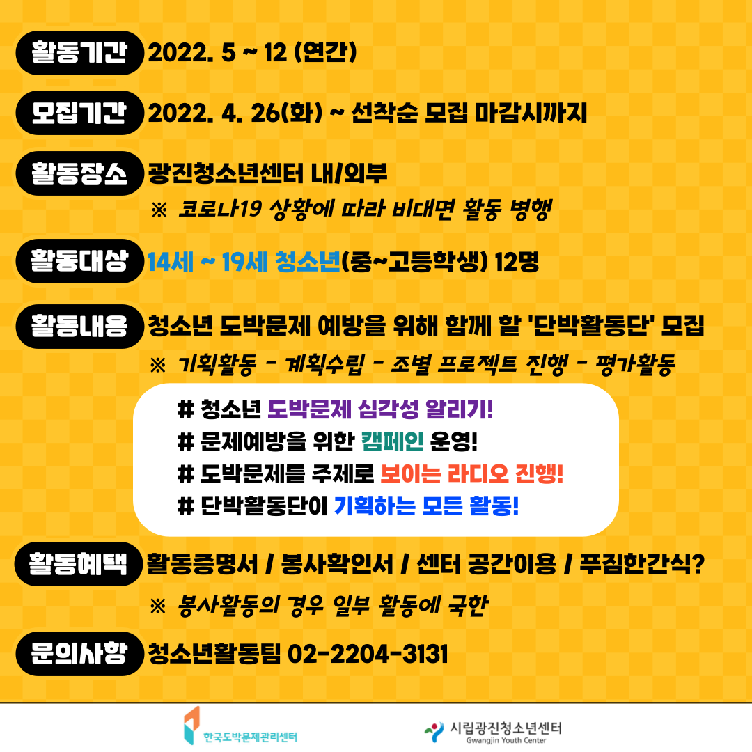 2022³â û¼Ò³â µµ¹Ú¹®Á¦ ¿¹¹æÀ» À§ÇÑ '´Ü¹ÚȰµ¿´Ü'À» ÇÔ²²ÇÒ ´Ü¿øÀ» ã½À´Ï´Ù. Ȱµ¿À» Èñ¸ÁÇϴ û¼Ò³âÀº ¾Æ·¡ ½Åû¼¸¦ ÀÛ¼ºÇØÁÖ¼¼¿ä! ¸¹Àº °ü½É Âü¿© ¹Ù¶ø´Ï´Ù!