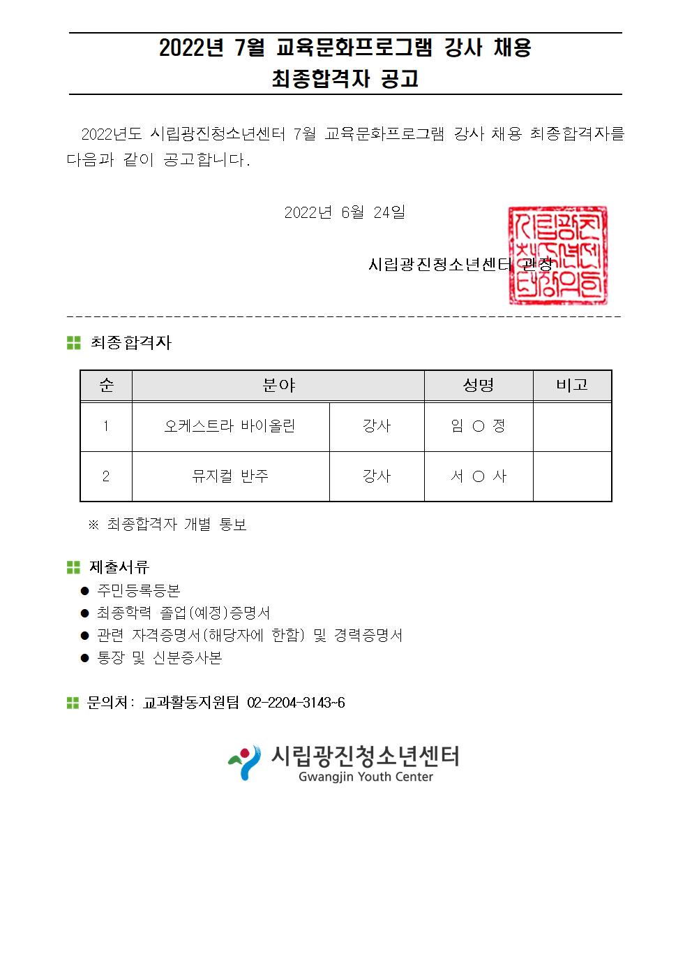 [°»çä¿ëÇÕ°ÝÀÚ°ø°í]2022³â 7¿ù ±³À°¹®È ÇÁ·Î±×·¥ °»ç ä¿ë ÃÖÁ¾ÇÕ°ÝÀÚ °ø°í | ||