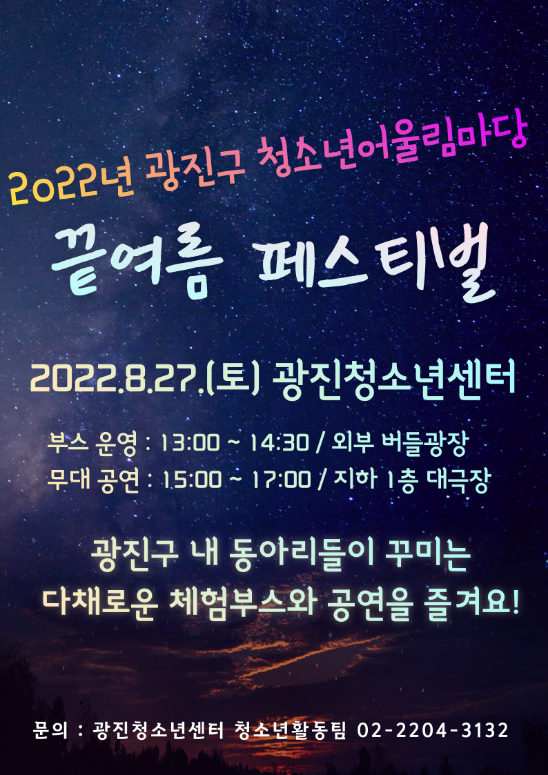 | ÀÌÀü±Û | 2022³â ±¤Áø±¸ û¼Ò³â¾î¿ï¸²¸¶´ç '³¡¿©¸§ Æä½ºÆ¼¹ú' ¹«´ë °ø¿¬ Èñ¸ÁÀÚ ¸ðÁý ¾È³» |