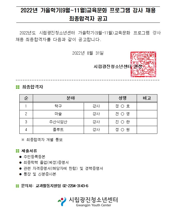 | [°»çä¿ëÇÕ°ÝÀÚ°ø°í] 2022³â °¡À»Çбâ (9~11¿ù) ±³À°¹®ÈÇÁ·Î±×·¥ °»ç ä¿ë ÃÖÁ¾ ÇÕ°ÝÀÚ °ø°í | ||