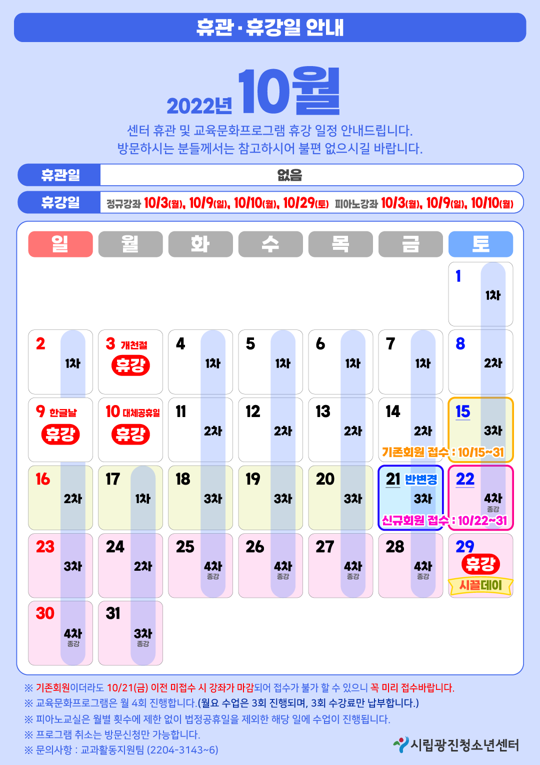 2. ÈÞ°ÀÏ : ¡Ü Á¤±Ô°Á 10/3(¿ù), 10/9(ÀÏ), 10/10(¿ù), 10/29(Åä) ¡Ü ÇǾƳë°Á 10/3(¿ù), 10/9(ÀÏ), 10/10(¿ù)